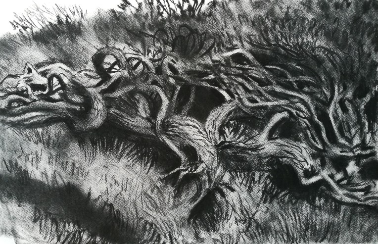 I headed north, facing the ragged collection of fishermens’ huts at ‘Sorthat Odde’. The sun had broken the horizon now, and the fine colours together with the contour-like lines of shingle and seaweed left by the waves caught my eye. I made an unsuccessful study of some mosses, lichen and a small dead fish which I found on the water’s edge (a sea trout, a smolt?), and then a charcoal drawing of an incredible root system of a pine tree, perched on the edge of the dune between the beach and the forest. The black centre surrounded by twisted roots looked like a portal to the underworld.