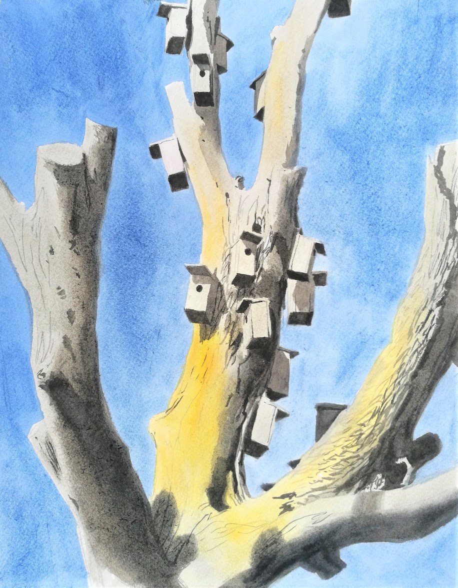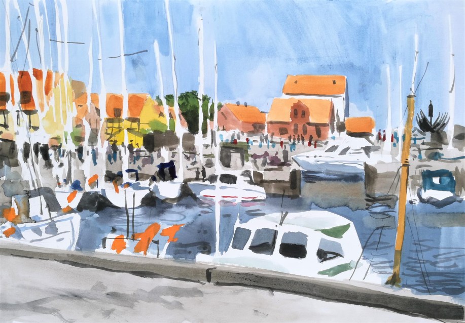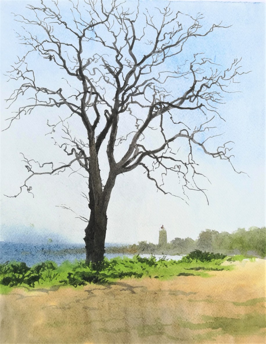 I painted the dead elm tree just before Svaneke harbour, with the lighthouse in the background. It was burning hot in the sun.