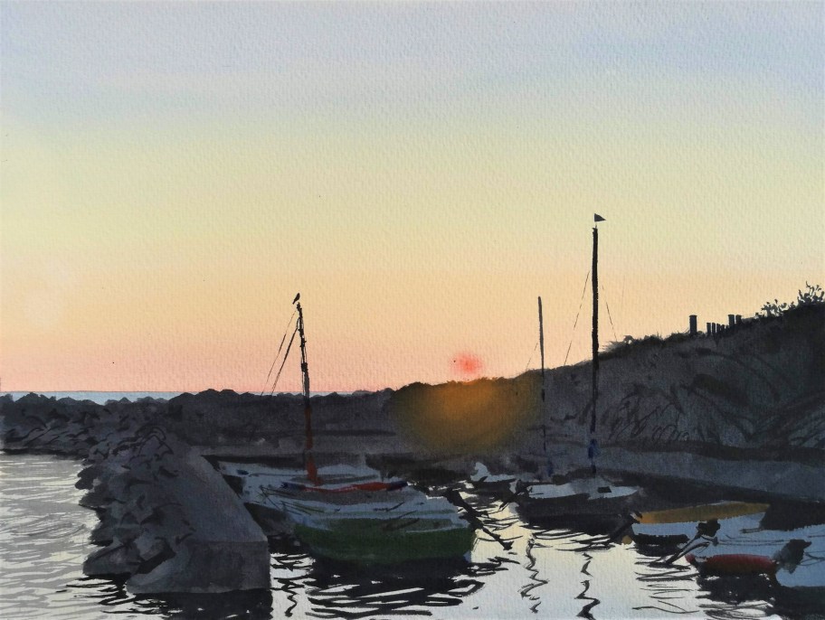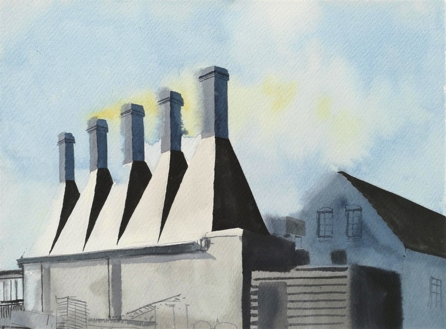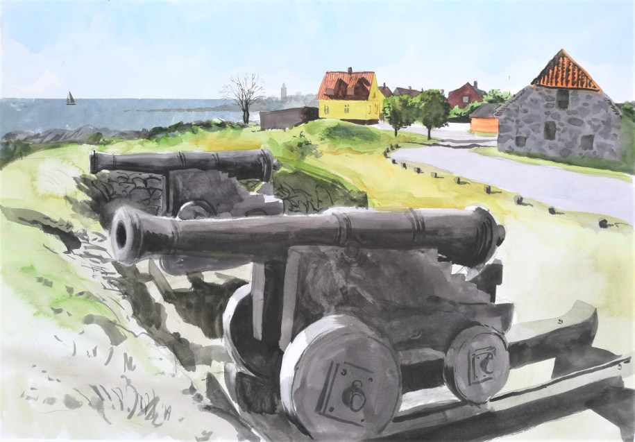 I walked towards Svaneke and paused to paint the five chimneys of Svaneke’s Smokery (one of which was already smoking) – one of the few smokeries remaining in use from the scores that encircled Bornholm a century ago.