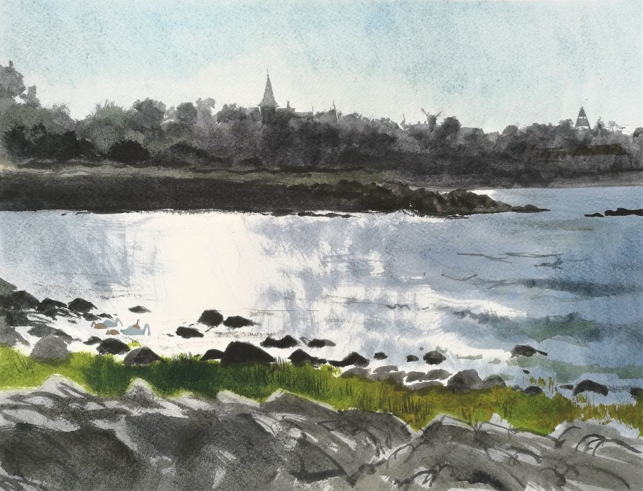 I carried on and explored the wild and rocky landscape approaching the lighthouse. The sun was quite low now and I looked back towards the picturesque and historic town of Svaneke, one of Bornholm’s most popular destinations (and the venue for the opening exhibition of the KYST project next year). The church steeple, the Mill and the water tower designed by Jørgen Utzon were all visible. Svaneke means ‘swan bay’ and only later did I notice the happy coincidence of the swan family in the foreground of the painting.