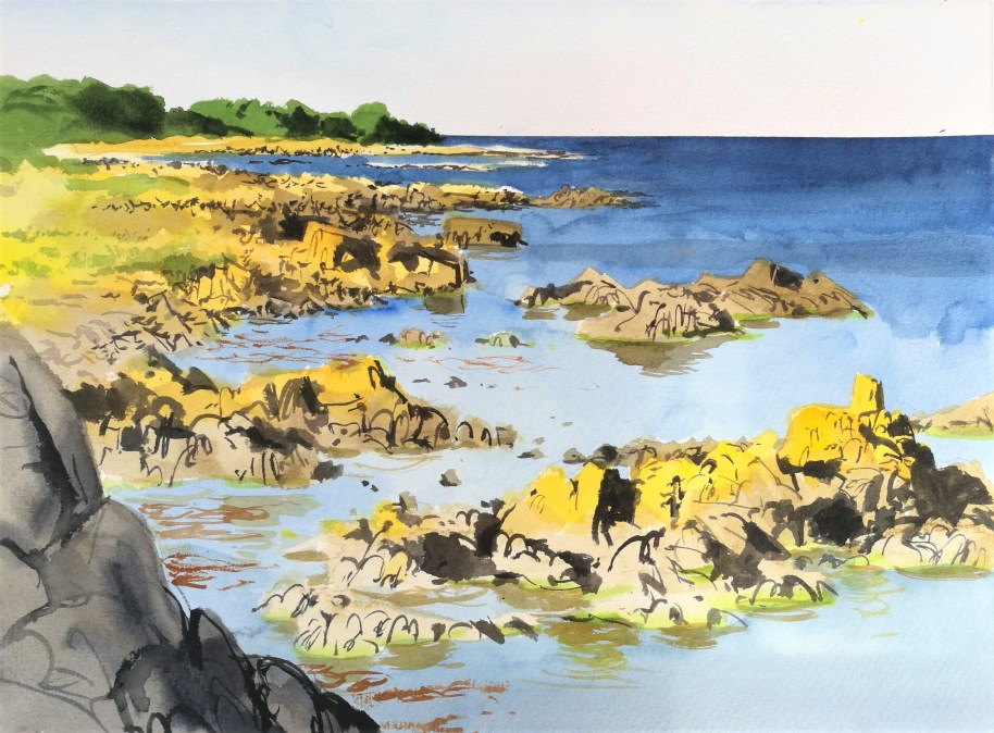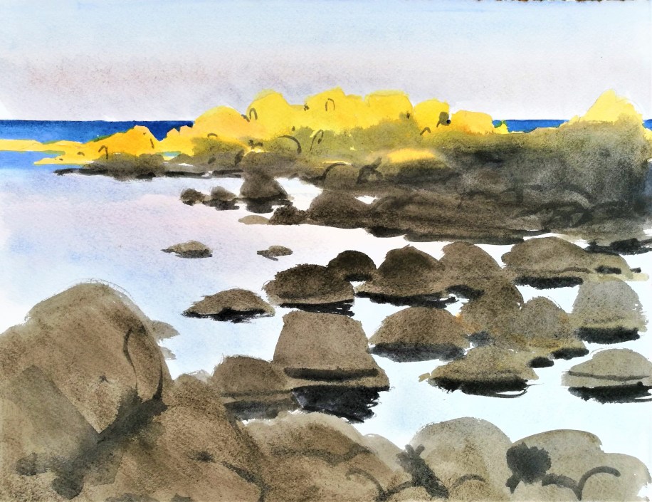 I finally entered the harbour with an hour to go before sunset. I thankfully refilled my water bottled and boiled some food. Again, the air was filled with the mechanical maniacal screaming of swifts. Just minutes remained for me to finish off with a painting of the harbour arm, and as the sun finally set my brother appeared to collect me.
