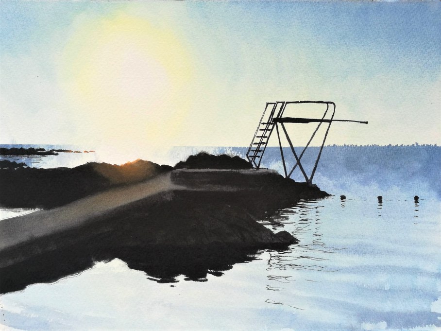 The waters under the diving board at Hullehavn were still and untouched. Whilst I painted, the first bathers arrived and jumped in.