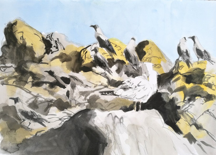 I walked on a little over the crumbling granite boulders veined with thick rock crystal. A herring gull appeared white and pristine against the lichen covered rocks. Some hooded crows lurked in the background, surprisingly camouflaged.