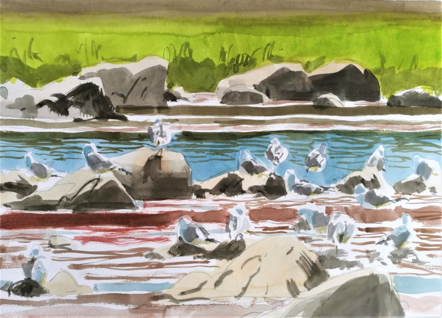 I jumped off the cliffs again into the water then walked on a little and came to a small landing stage. Here I looked back towards the gulls, this time with the light behind me. The head of one exhausted common gull kept slowly drooping, until he awoke with a start, reminding me of a sleepy life drawing model I once had in England.