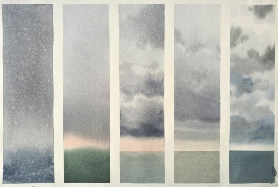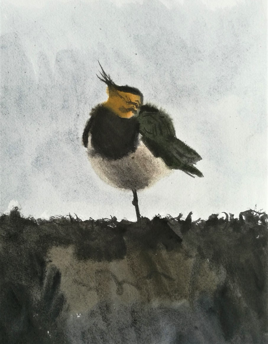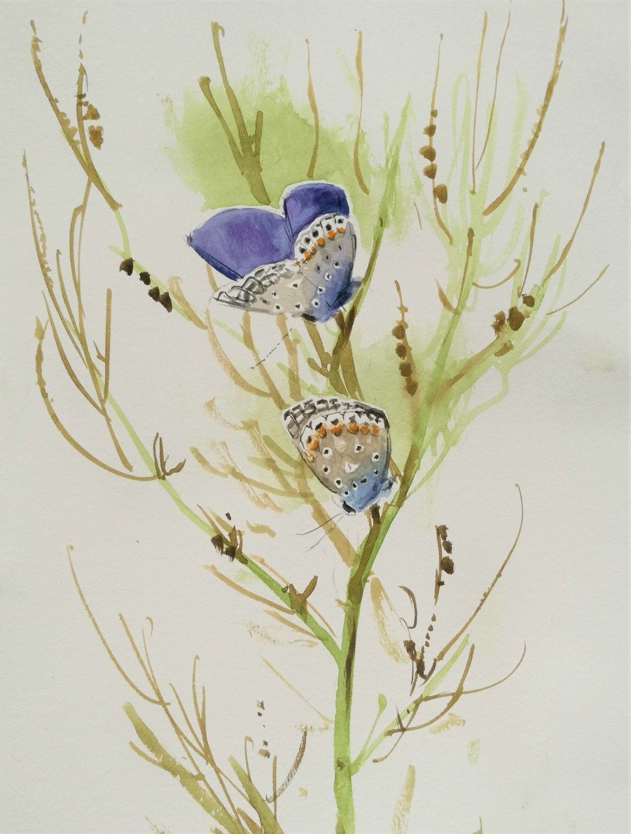 Just after I had packed my things and walked on, a tiny ice-blue butterfly flew by and alighted on the seedhead of a nearby plant. I unpacked again and stealthily approached the butterfly, a common-blue, with my paper and paints. Amazingly it remained still, at one point even relaxing its wings – a most obliging model.