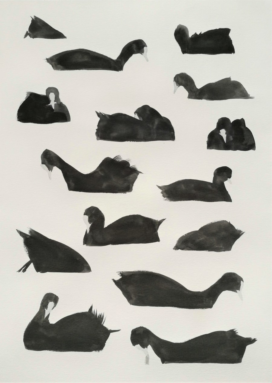 Farther out, the silhouetted dark shapes of a flock of coot were amicably diving together after seaweed, a world away from the aggressive and territorial thugs they turn into in springtime.