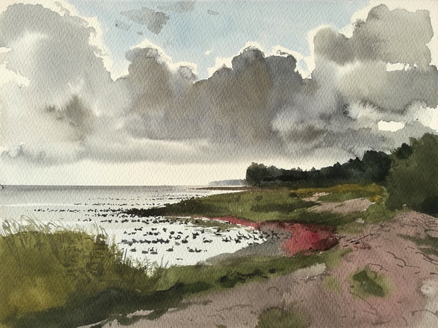 Now that the rain had stopped, I wandered around the wasteland, under the whirring blades of two huge wind turbines. The grey weather presented a somewhat depressing backdrop to the piles of earth, tractor tracks and industrial silhouette of Nexø harbour, but the area was fascinating and charming in its own right, with a rich biodiversity of flowers, insects and birds. I sat and sketched the strange forms of the flora when suddenly a sparrowhawk shot by, after a flock of starlings.
