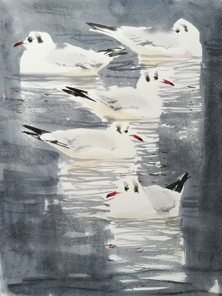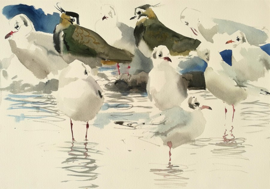 Eventually the penny dropped and I realized how hungry I was. I had some food and took a well-earned break, happy to sit back and watch the show. My mood had imperceptibly transformed from irritable to contemplative, and from my vantage point on the edge of the beach I had an incredible 180 degree view of the sea, the sky, and the constant activity of the birds. I marveled at the incredible richness of the panorama, and drank in the colours, the sounds and the smells surrounding me. Now that the geese had mostly vacated the area, the more gentle piping and wheezing of the multitude of wader species filled the air and periodically the sun would briefly appear from between the clouds, and cast a magical warm light on the birds. In the early evening glow I detected the most delicate rose tint on the breast of some black headed gulls, lazily swimming in the deep grey-blue reflection of the passing rain clouds above.