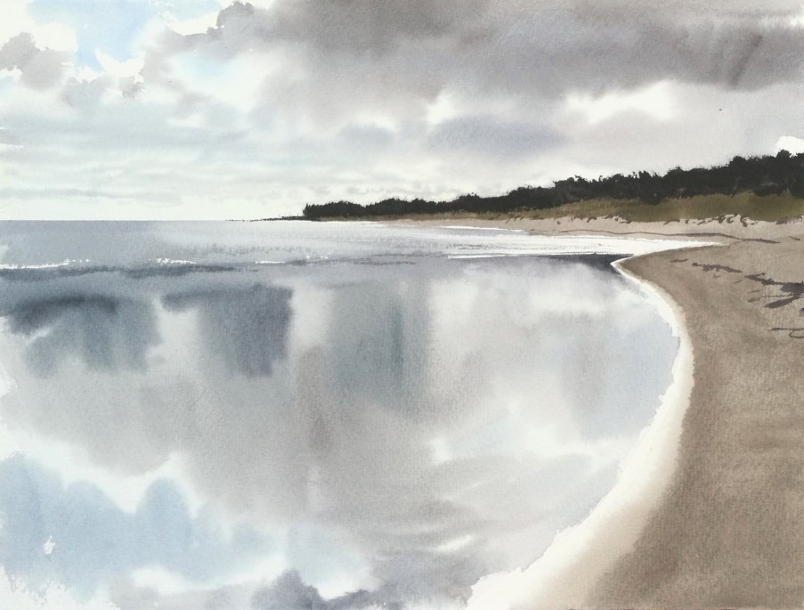 As I continued walking along the beach my eye was caught by the rills, folds and patterns in the sand caused by the action of the waves lapping at the shore, together with the tracery left by mica, crushed mussels and seaweed. A sandbank created a lagoon of completely still water that reflected the clouds scudding by in the dynamic skyscape. I made two studies (see also top)