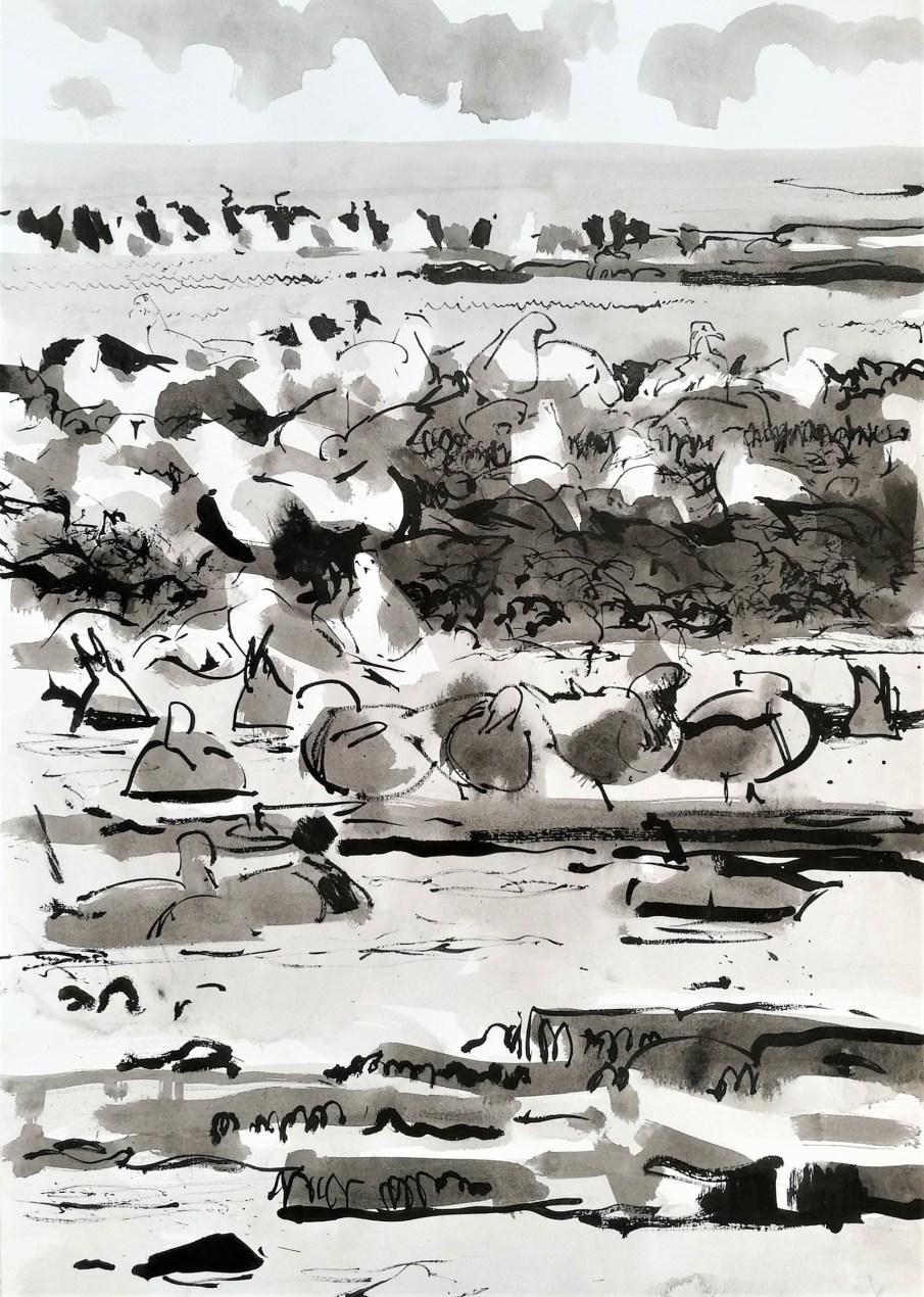 I carried on along the beach all the way to the end of the bay at Snogbæk, where I set up the M60 and had lunch and a really good sleep. On waking I looked towards Salthammer Odde, the great shelf of grey balka sandstone that juts out from Snogbæk and continues under the sea, attracting a rich diversity of sealife and birds. All week with the students we had been concentrating on tonal values and working with ink, which I had bought along. I tried to capture the movement of the feeding frenzy on a bank of seaweed, where gulls, geese, crows, pigeons and starling all worked together feverishly, hoovering up sandflies and the like.
