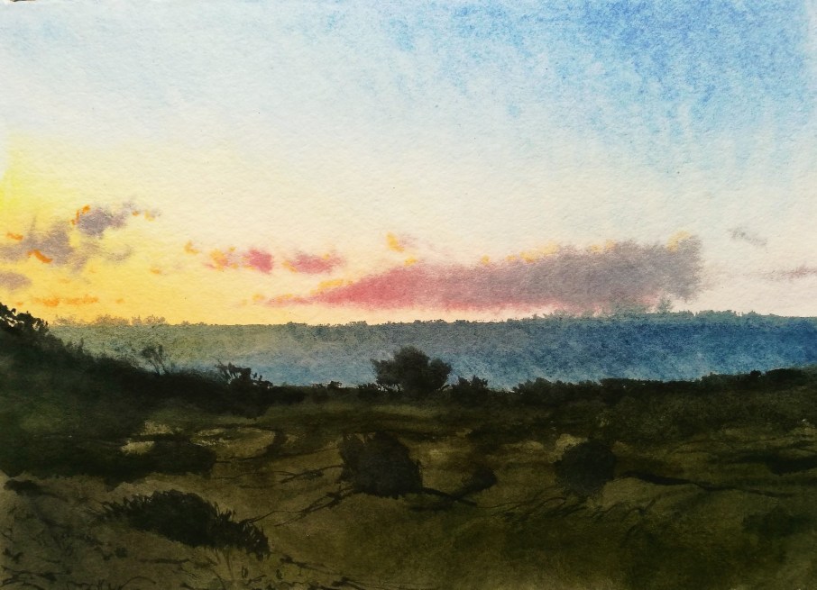 Further on still, my attention was caught by the shapes of the shifting sand in the dunes. Close to the shore, the forces of gravity and wind had created a miniature but ephemeral likeness of the Grand Canyon, not a metre high. Even whilst I sat there and painted small cascades of sand would periodically fall from the cliff face and gather on the slope below, as if time itself was sped up. Geological process that would usually unfold over thousands or even millions of years, were being played out before me, and as my eye soared over the sandy canyons I sensed a giddy feeling of omnipotence, as if I could control time and space.