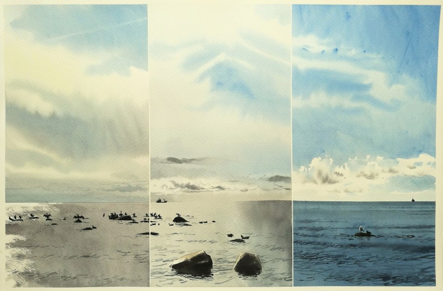 I walked on, to the tiny harbour at Bakkerne, where a collection of small fishing boats rocked gently on their moorings. Just inland, a motley collection of summer houses nestled in the dunes, together with a few more permanent looking houses. Returning to the beach I continued westward and soon arrived at Holster Odde, where scores of coromorants, gulls and mallards perched on the large boulders that lay scattered in the shallow water. The small cape at Holster Odde markes the boundary between the Silurian slate and the younger Cretaceous Rabække formation that continues westward – a jump of some 300 million years. I sat and marked the spot with a slice painting (see top).
