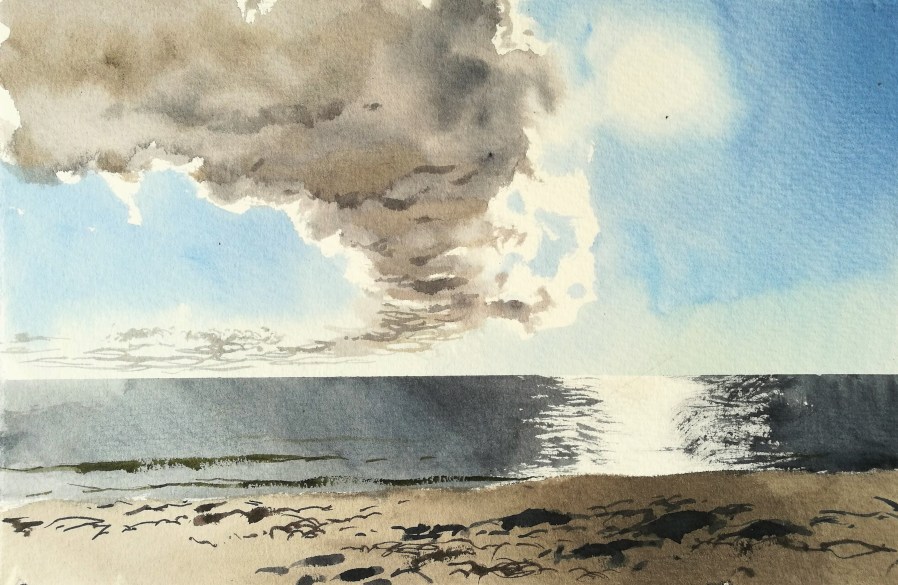 Now I walked all the way along the straight sandy beach to the Kadeau restaurant, in front of which I had arranged to meet someone. Sitting on the beach with the sun on our faces, it was difficult to believe that November was just a couple of weeks away. Several people swam in the crystal clear waters and I actually regretted not bringing a towel – to think I had been freezing just hours earlier. After some wonderful brownies and coffee, I continued westward, stopping to sketch the cloud formation that had momentarily obscured the sun and caused the temperature to plummet.