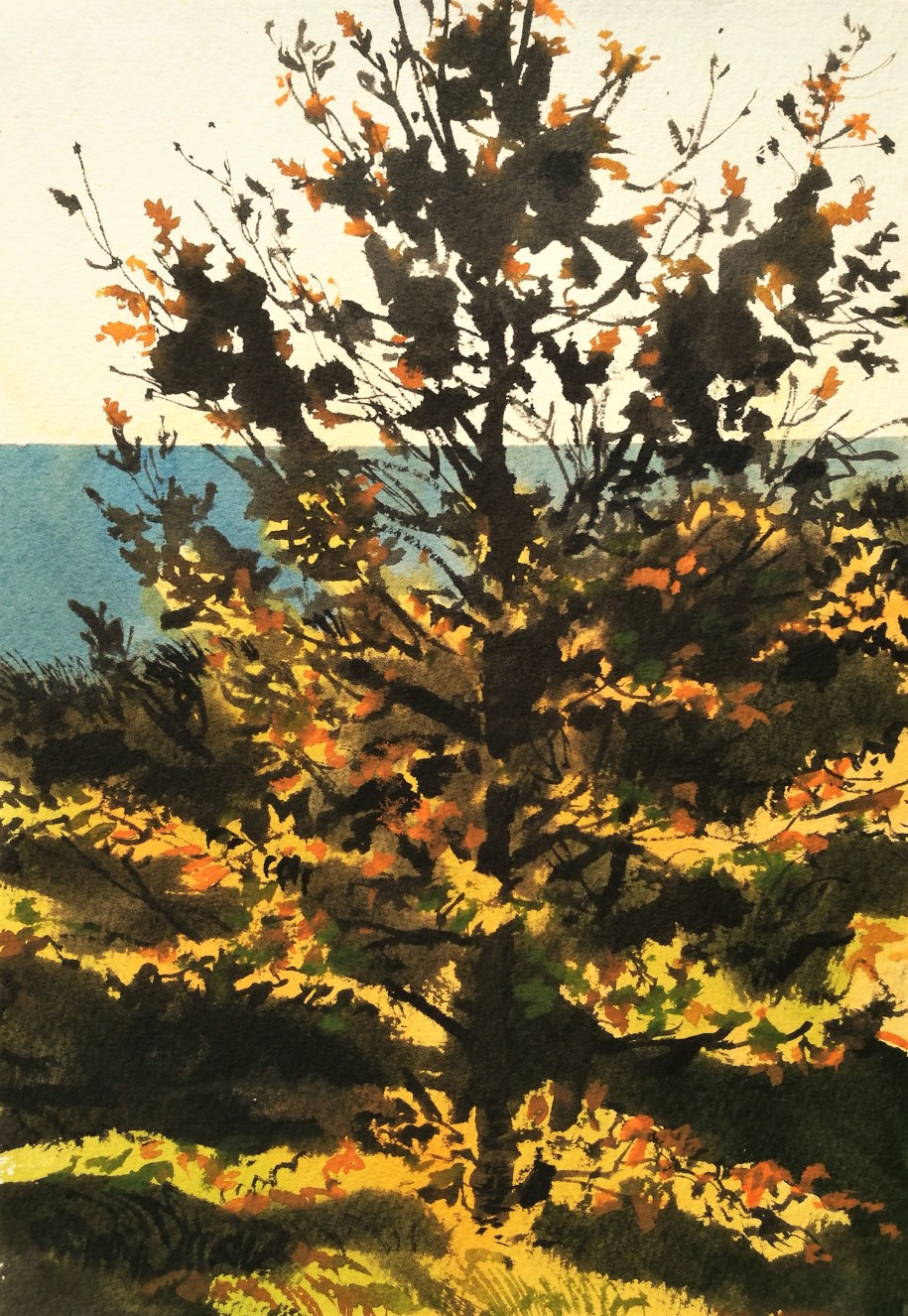 Above, there was an almost constant stream of birds on the move: thrushes, siskins and greenfinches, with sparrowhawks and rough legged buzzards higher up. Eventually I moved down to the beach and basked in the warming sun. I painted the Ole stream emptying out into the sea – the unseasonably warm and dry weather meant that there was little more than a trickle.