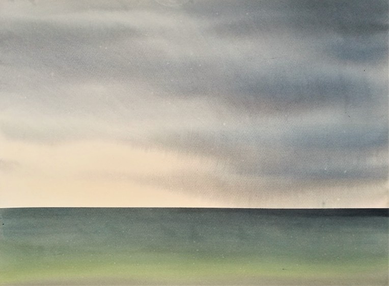 Hidden behind the clouds, the sun had already begun its descent and I was feeling pressured with my lack of physical and creative progress. At Dalegårdsodden I stopped for a quick lunch under the M60, where I became fixated on the subtle and understated tones and colours of the sea and sky. For the first time since starting the KYST trip, I worked on a full and uncut sheet of watercolour paper (detail, see also top).
