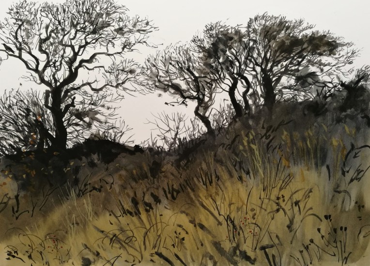 A fine dusty rain coupled with the generous washes of water and pigment meant that the paper took an eternity to dry. Before I could begin on the sea I needed to wait for the sky to dry somewhat, so I turned my attention to the rather stark and foreboding silhouette of the trees behind me. Most of the trees had dropped their leaves now, and it felt winter-like for the first time since much earlier in the year.