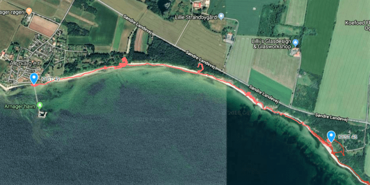 KYST 48 Warmly wrapped up in no less than seven layers of assorted clothing, I waddled down to the small beach hut where I had ended last week’s trip, straight into the teeth of a gale-force onshore wind. To the east, just behind a stand of pine trees, the rising sun briefly painted the thick layer of clouds with blood orange and crimson, before it was hidden completely – for the rest of the day as it turned out. As I struggled to paint in the gusty wind, it started raining (see above).