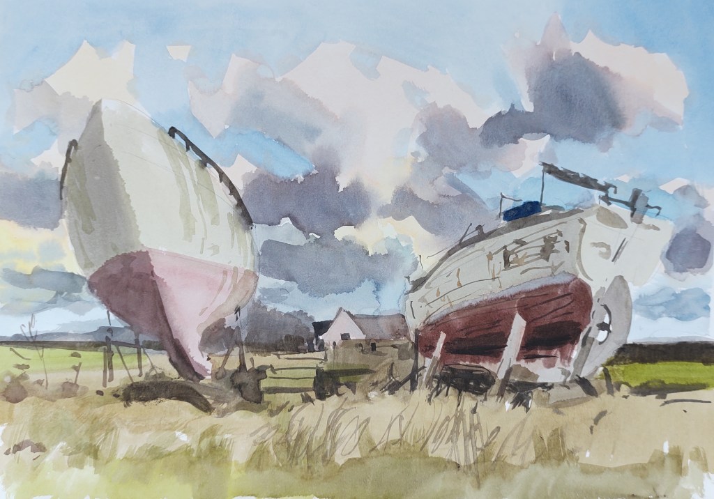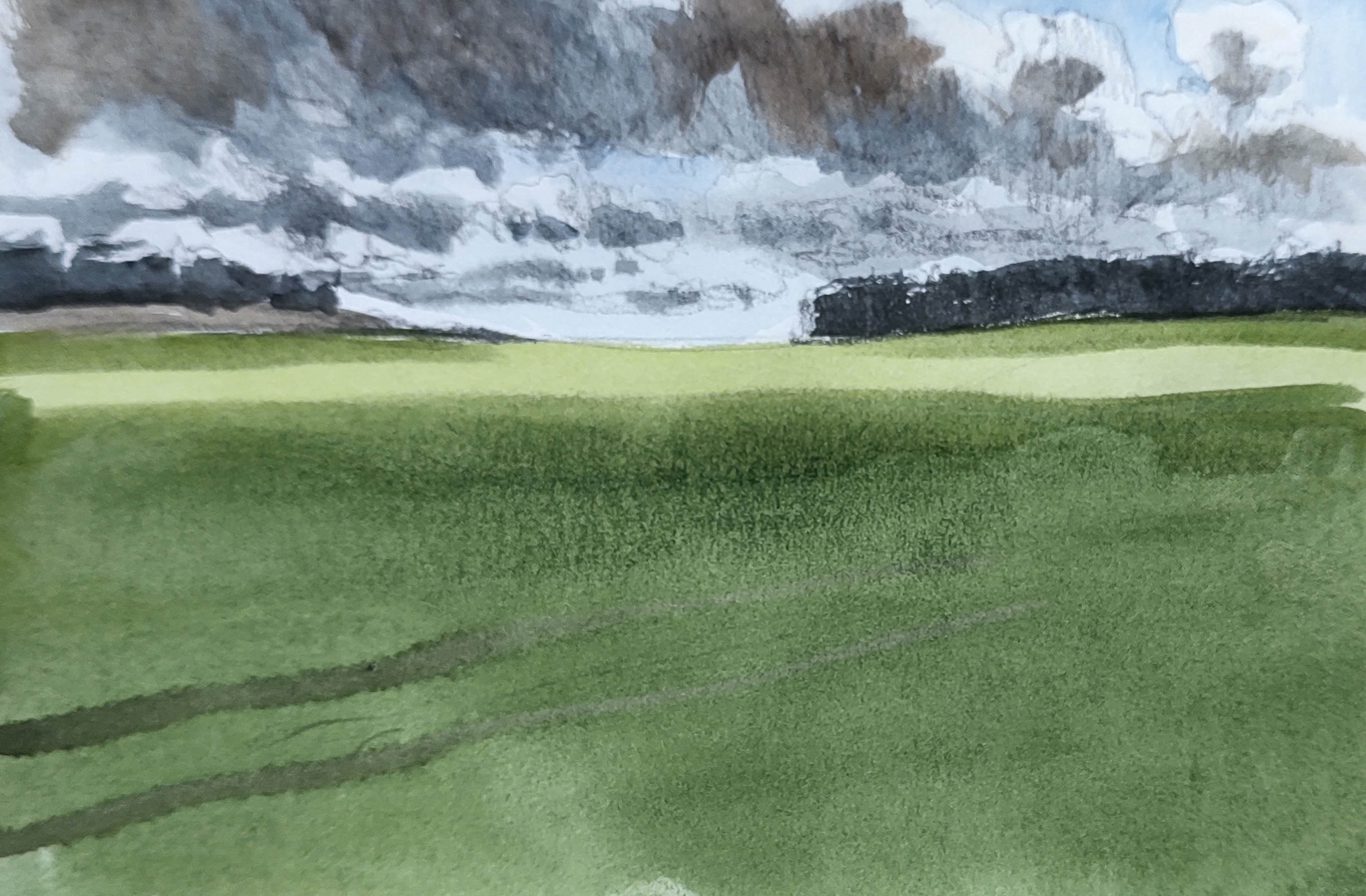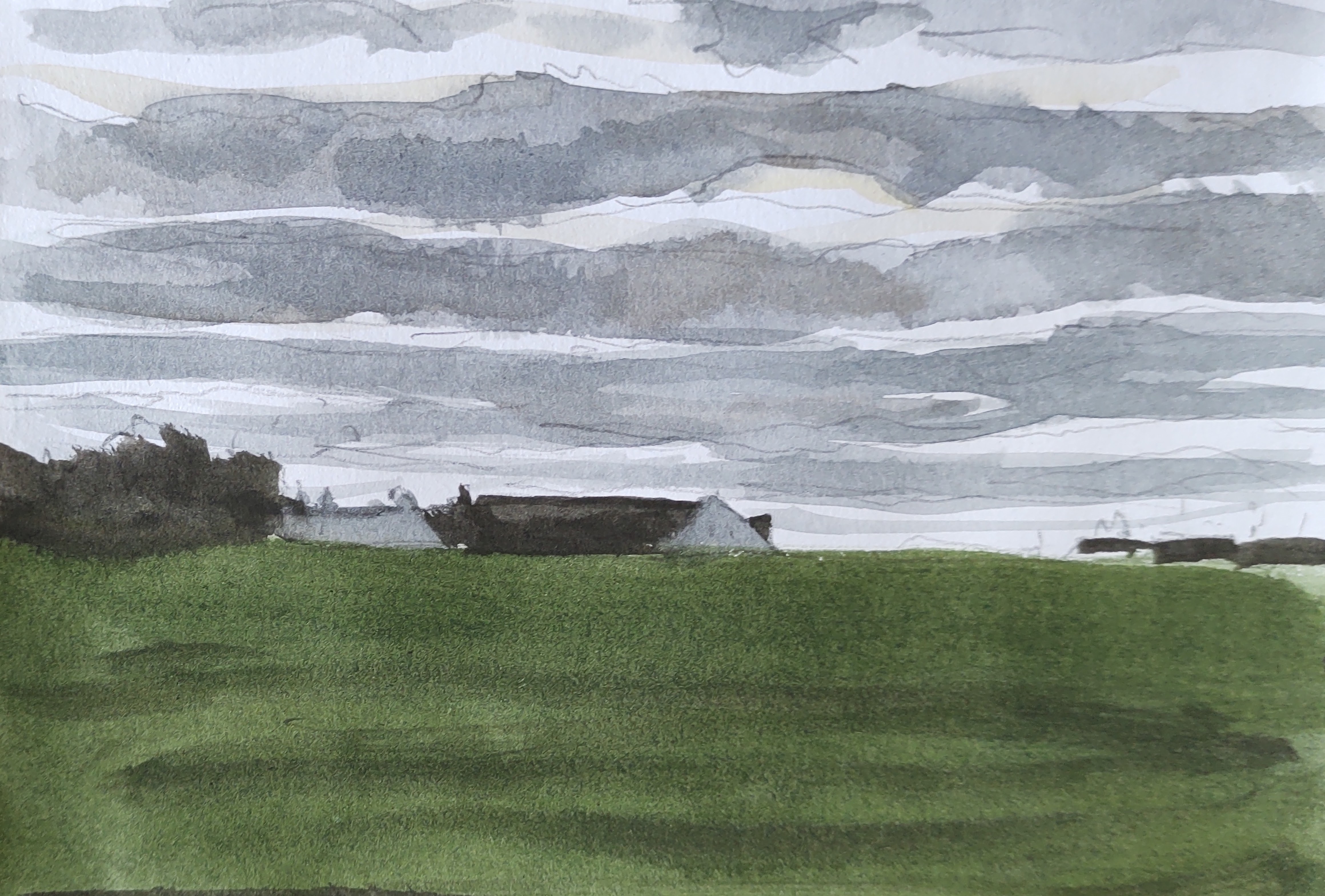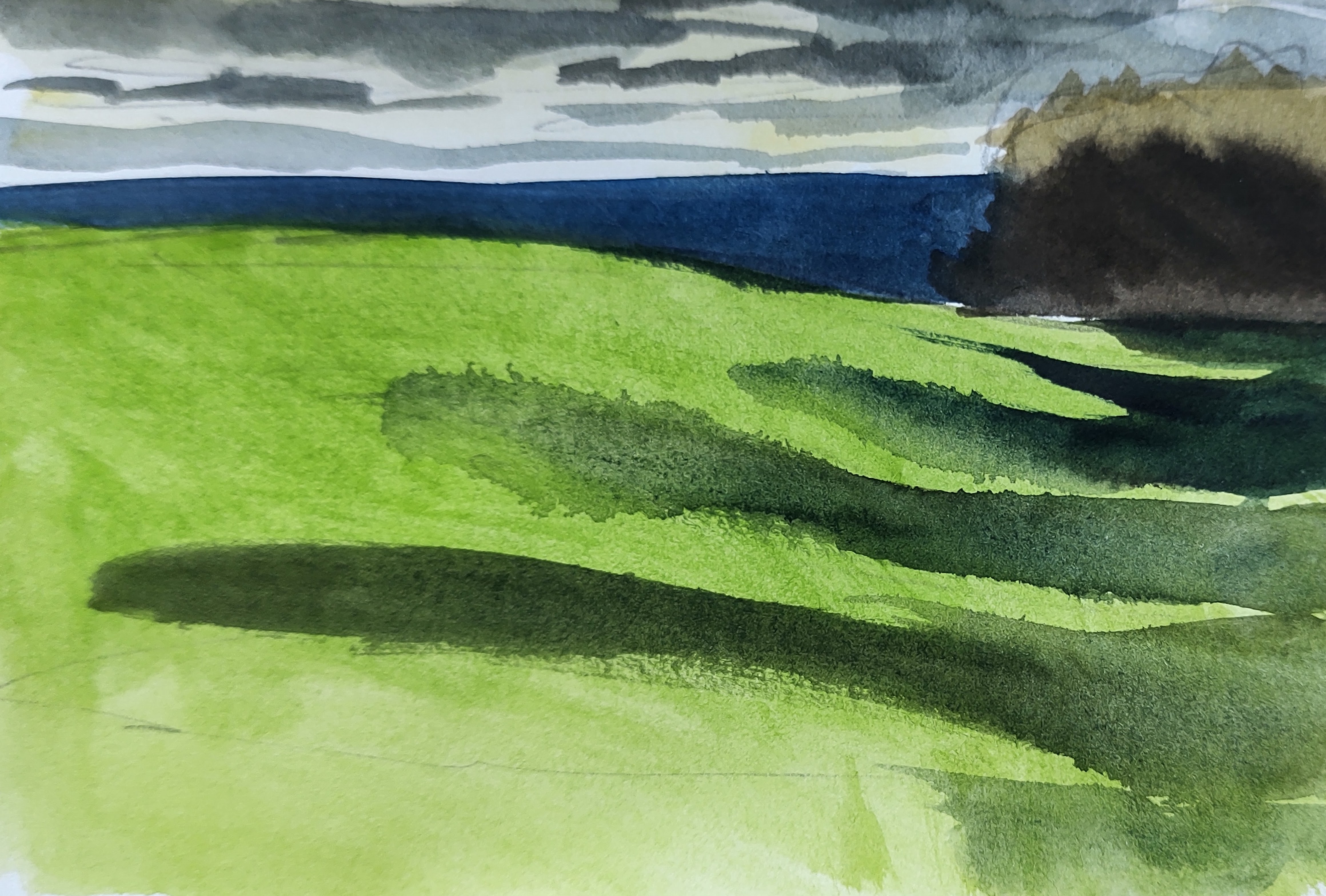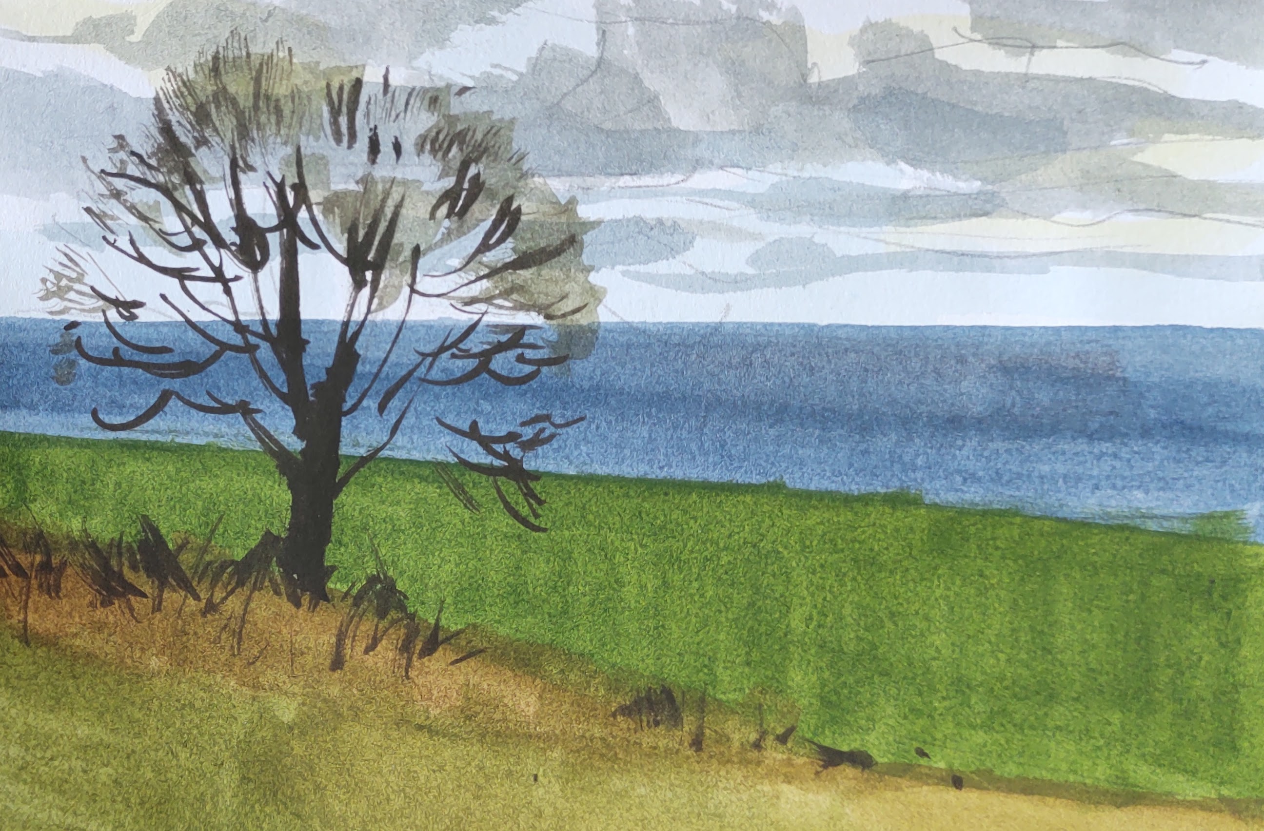 The sun was struggling to emerge behind horizontal bands of thick and low clouds. The north-easterly wind felt very bitterly cold. I made several small sketches trying to record the spatial and tonal relationships between the fields, the rows of trees, the sky, and the distant sea. Every now and then the sun would break through, casting slivers of dazzling light onto the landscape.