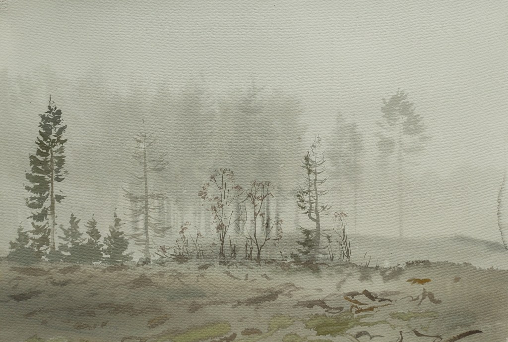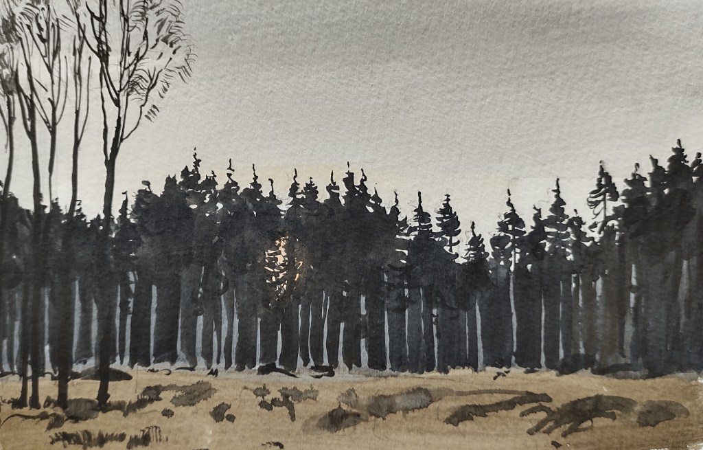 LAND 15 Friday again. A cold gunmetal dawn, with Bornholm hunkering under a thick layer of clouds. Nevertheless, for a fleeting moment, I saw the glowing ember of the rising sun through a stand of pines, fleetingly colouring the sky.