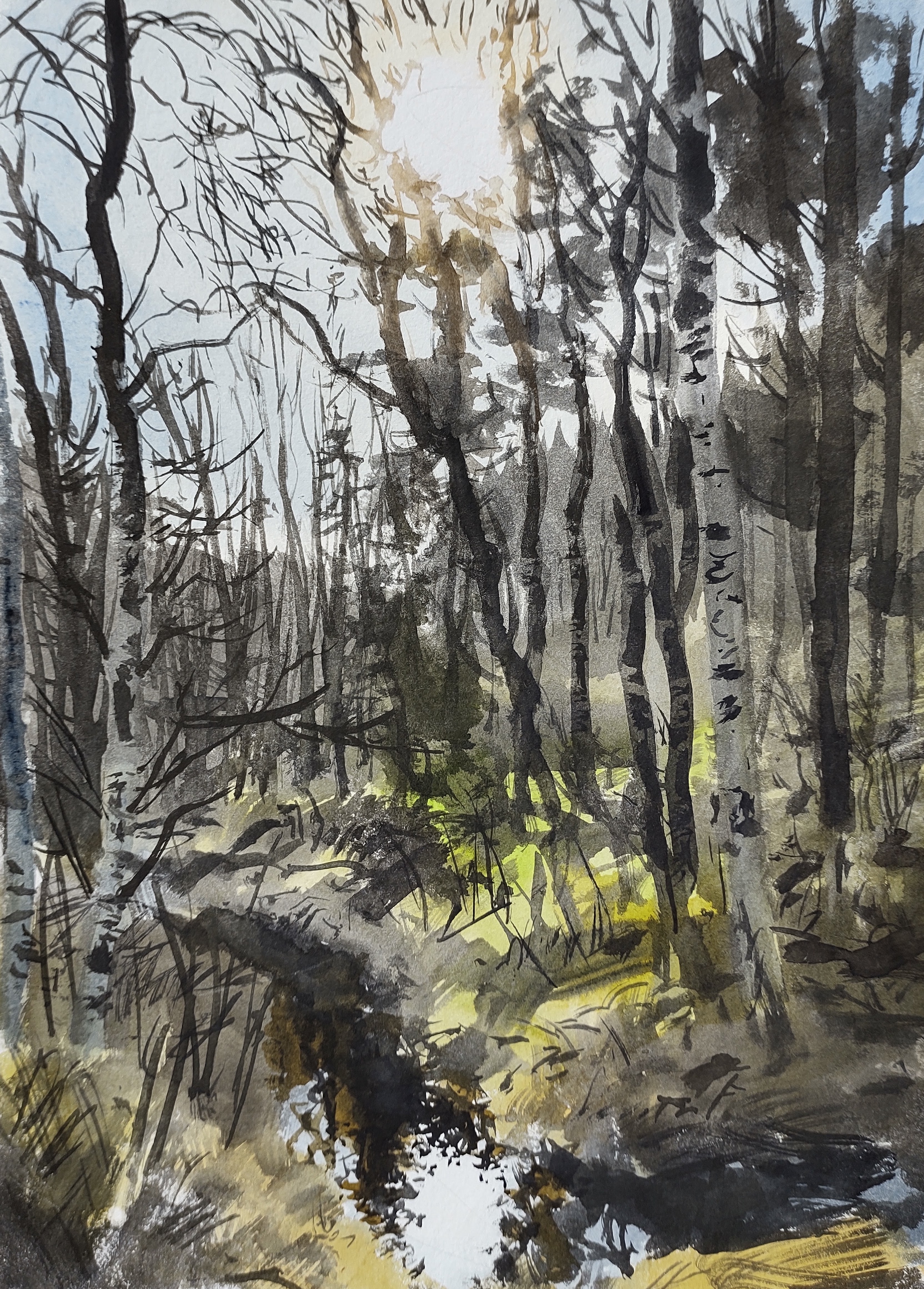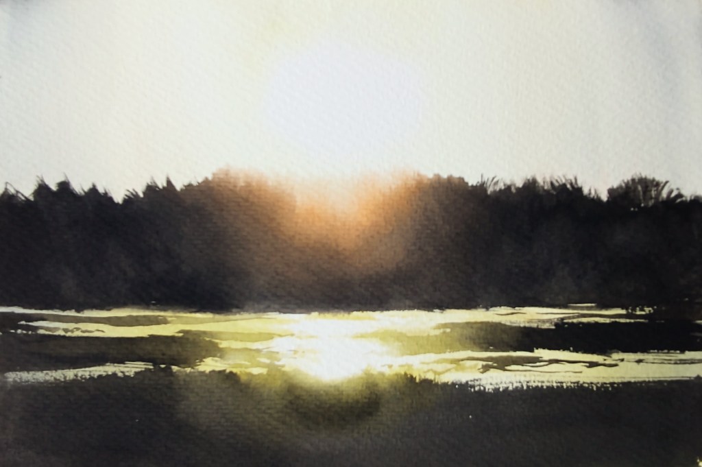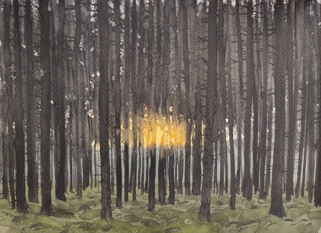 LAND 16 Dawn found me rearing to go – well slept for a change, and excited to see what the day would bring. The day’s forecast was fantastic, and the forest echoed with birdsong and promise. I painted the sun rising behind the fir trees and a nearby crane suddenly erupted into song, its unbelievably loud trumpeting calls reverberating through the cold and still morning air.