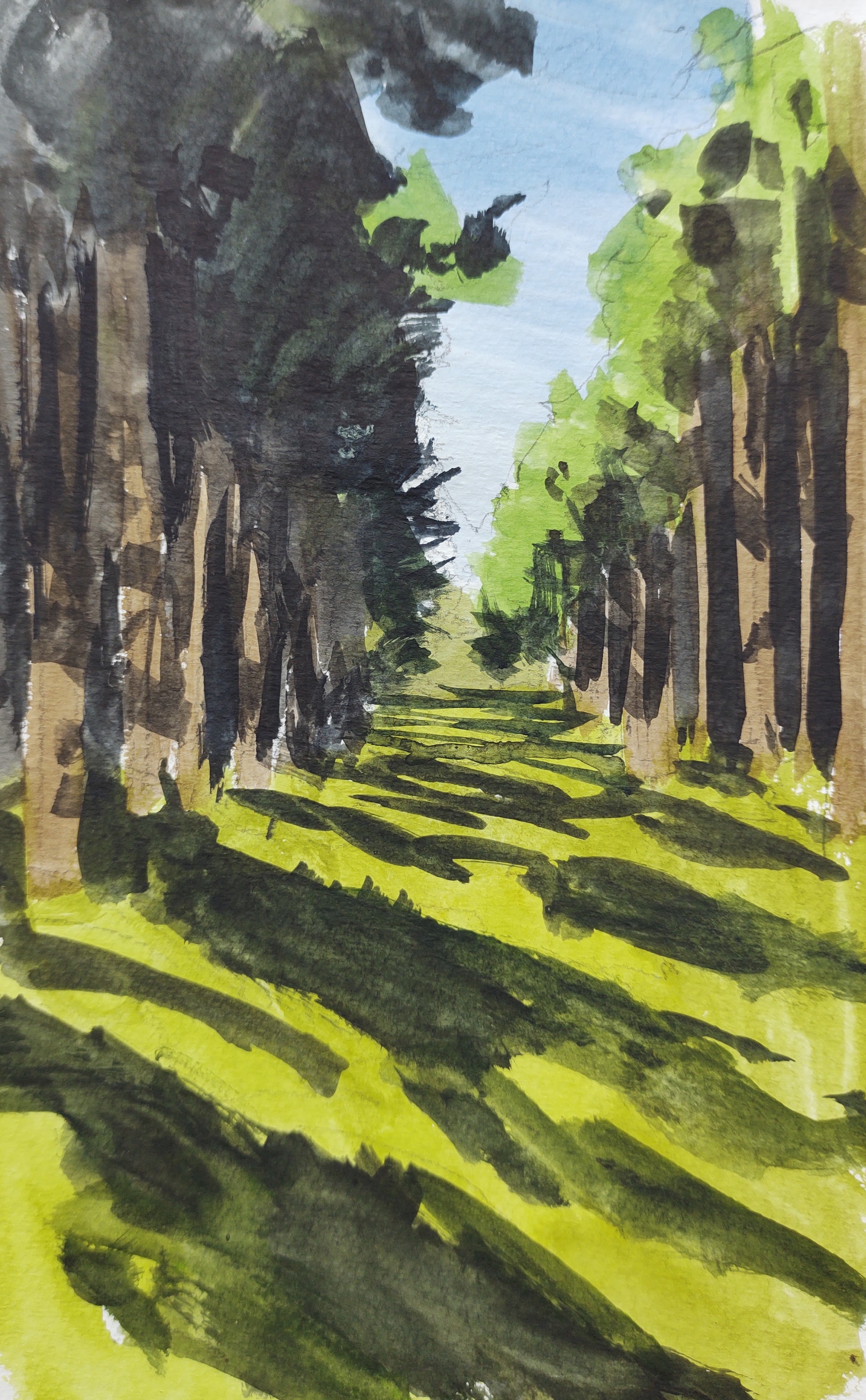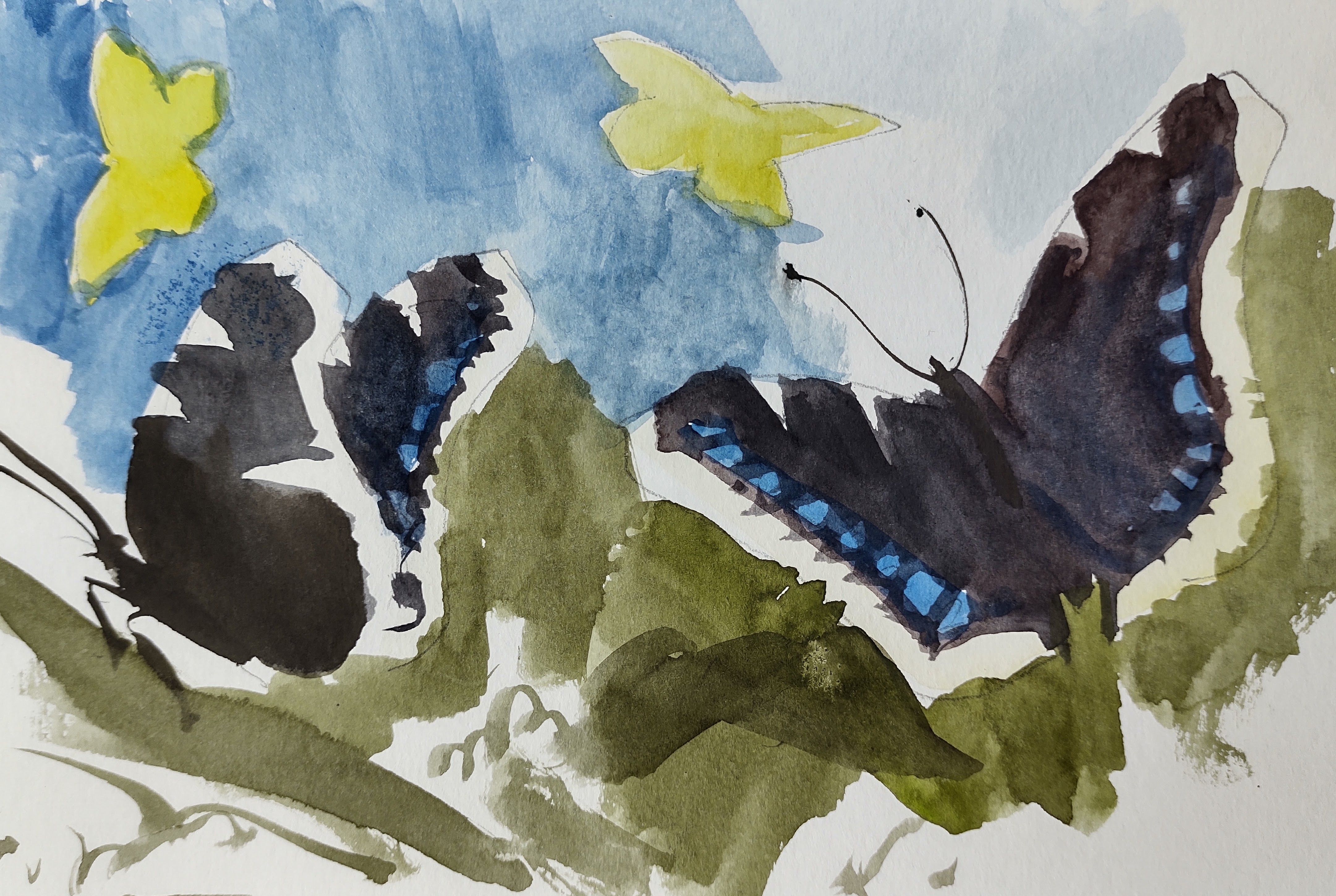 I headed south and then east through the woods. Not a soul was about. Not for the first time I was struck by the dissimilarity between paths, roads, and trails on the map – and their reality. At times I found myself with nothing to follow but ancient rutted tyre tracks. Common brimstone and mourning cloak butterflies, and even a jay, paused long enough for me to do some quick sketches.
