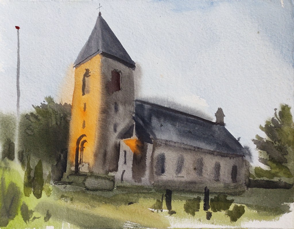 I walked the last four or so kilometres to Vestermarie – past our much beloved old house – and painted as the last rays of the sun lit up the side of the church.