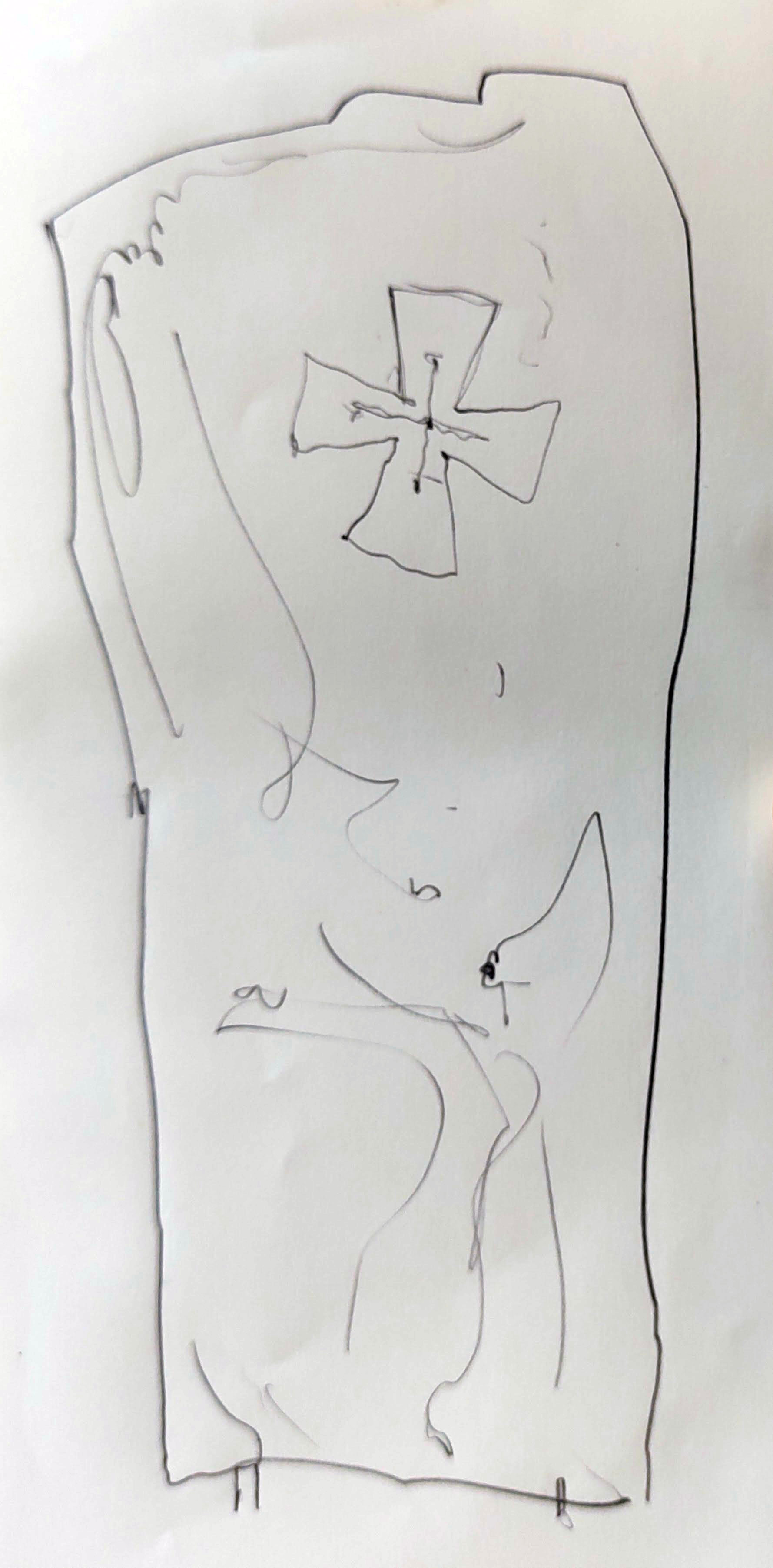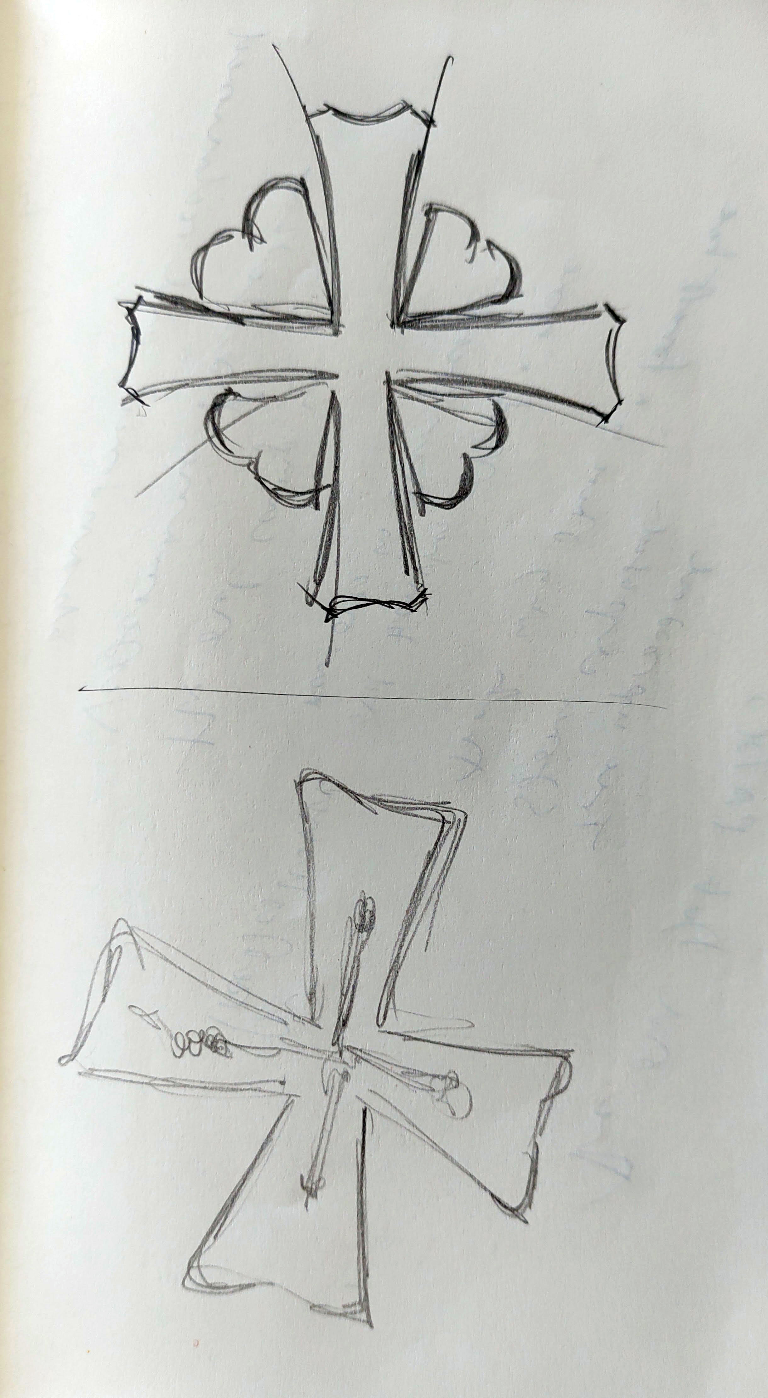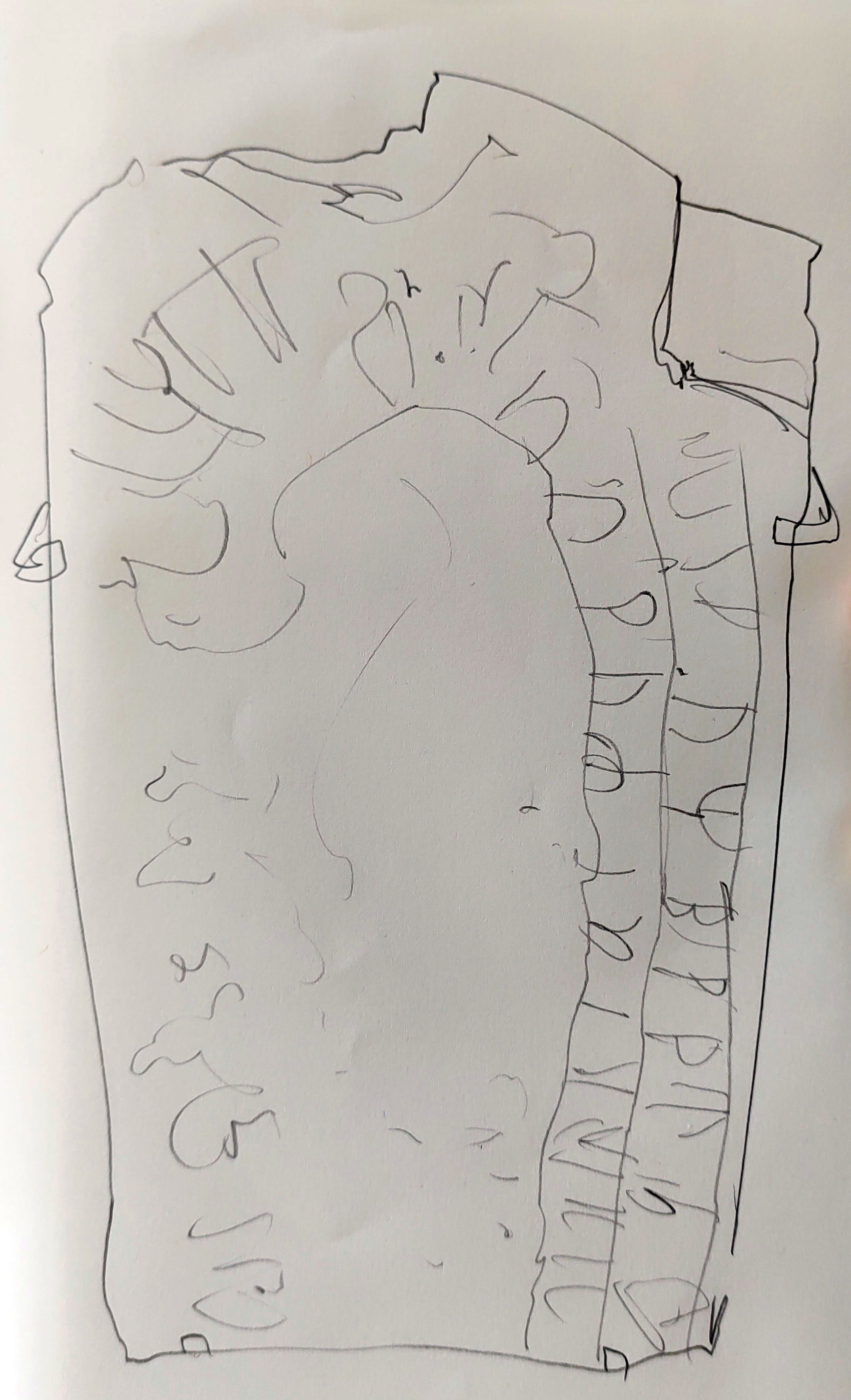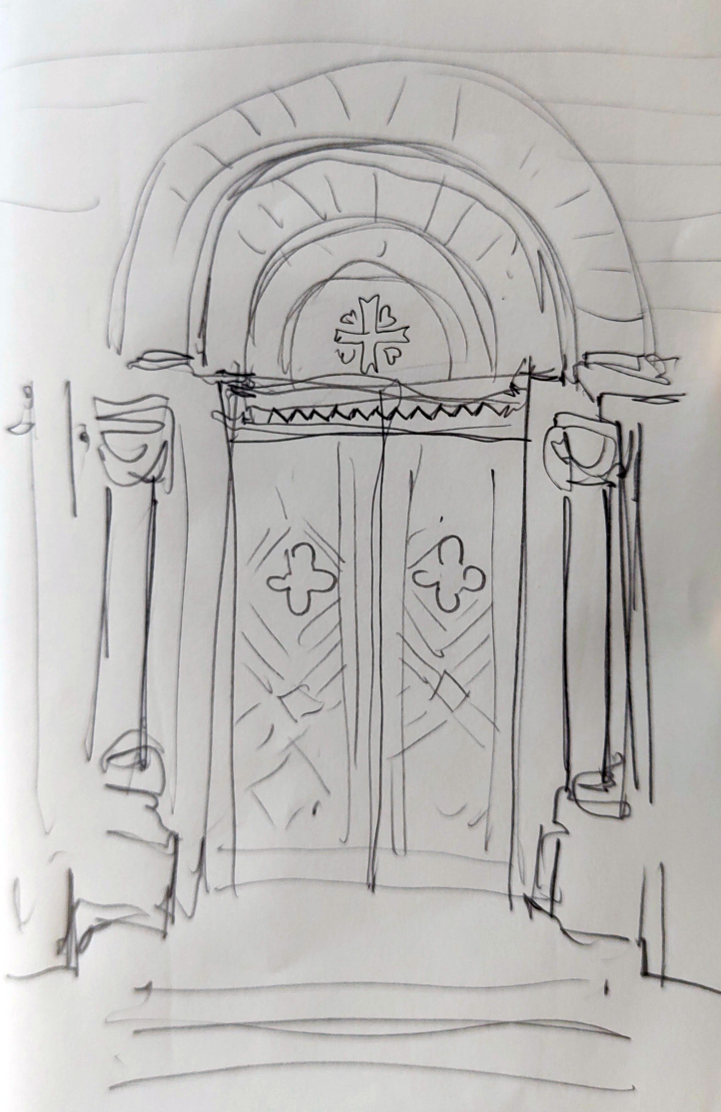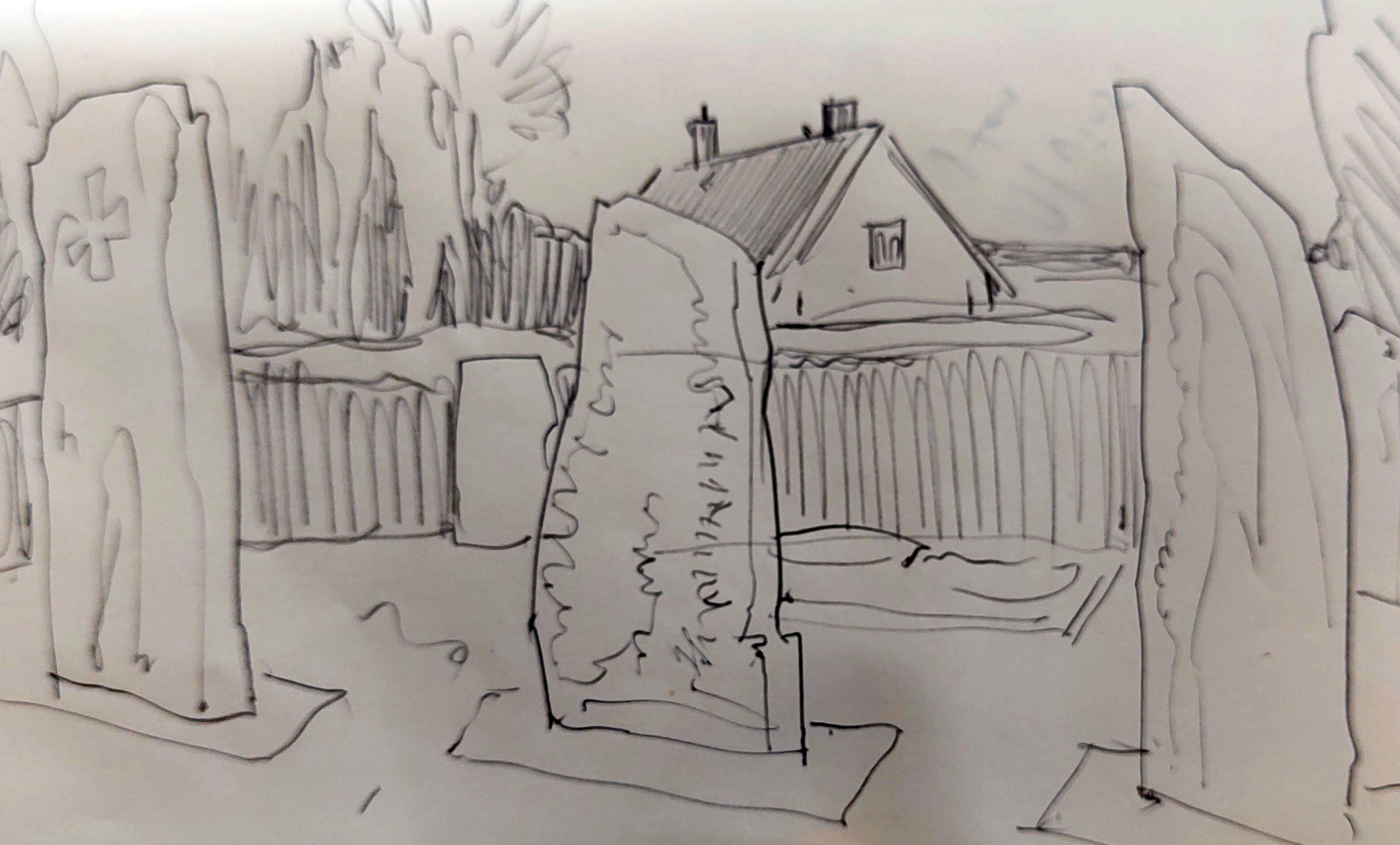 The church was built in 1885, replacing the original church dating from at least the 1300s. In the graveyard stood six runic stones, with a short description of their provenance. Some had been rediscovered during the building of the new church, and others had been found in nearby farms. They dated from the 11th century or so, just as Christianity’s arrived on the island, and all were written in the old runic script of the Vikings. I made some quick drawings, noting the similarity between the cross on one of the stones and the cross above the smart new door of the church.