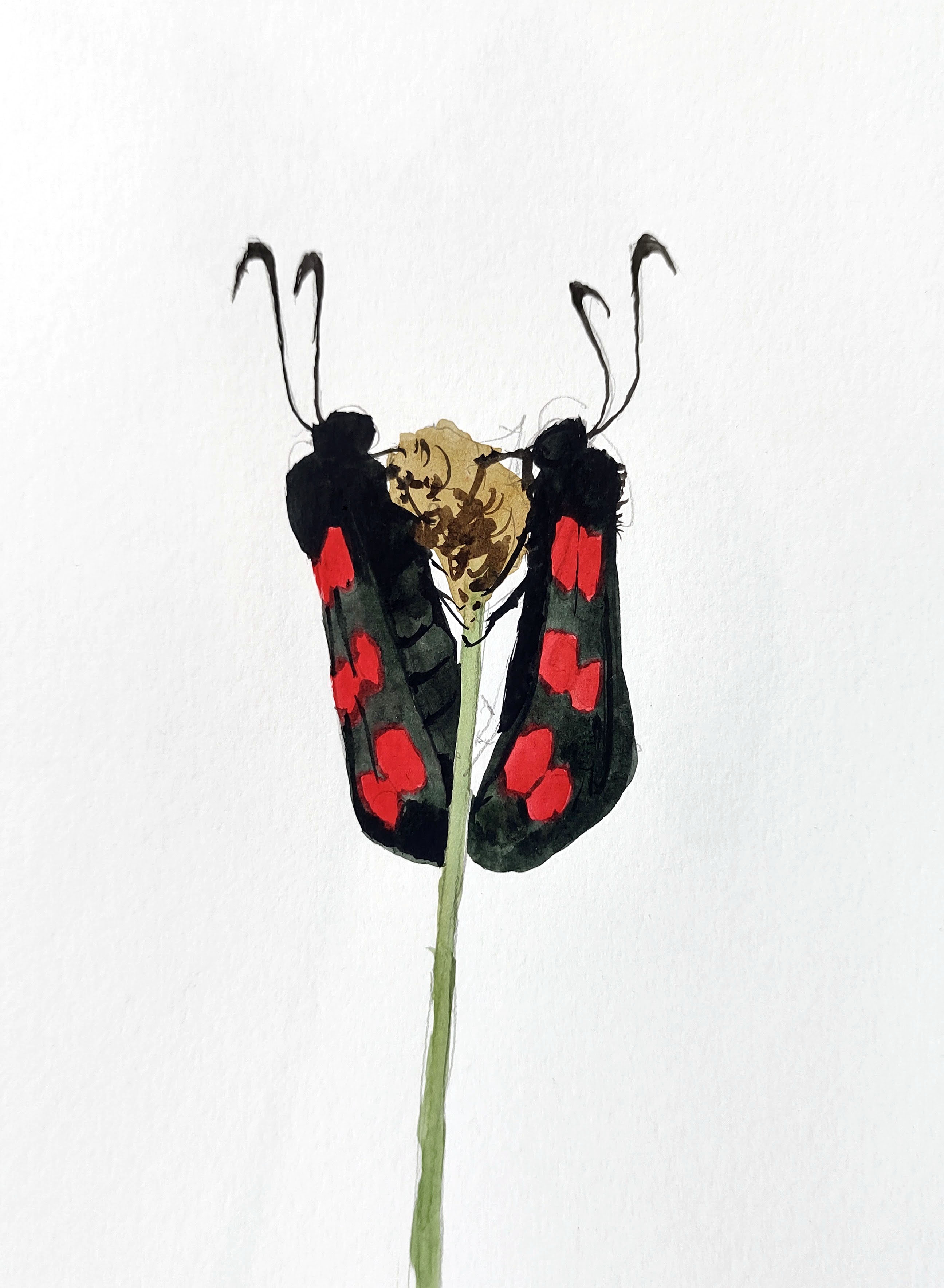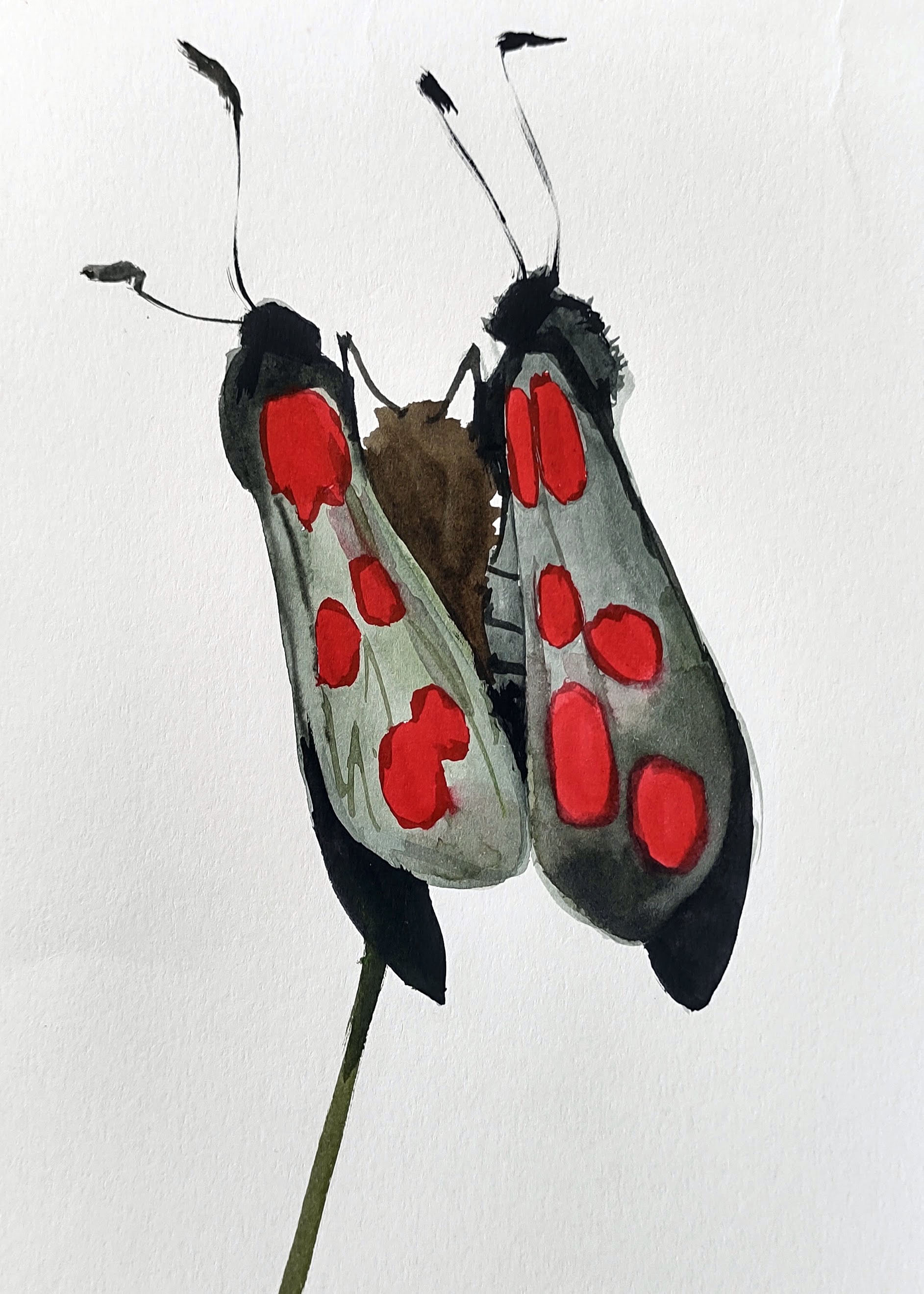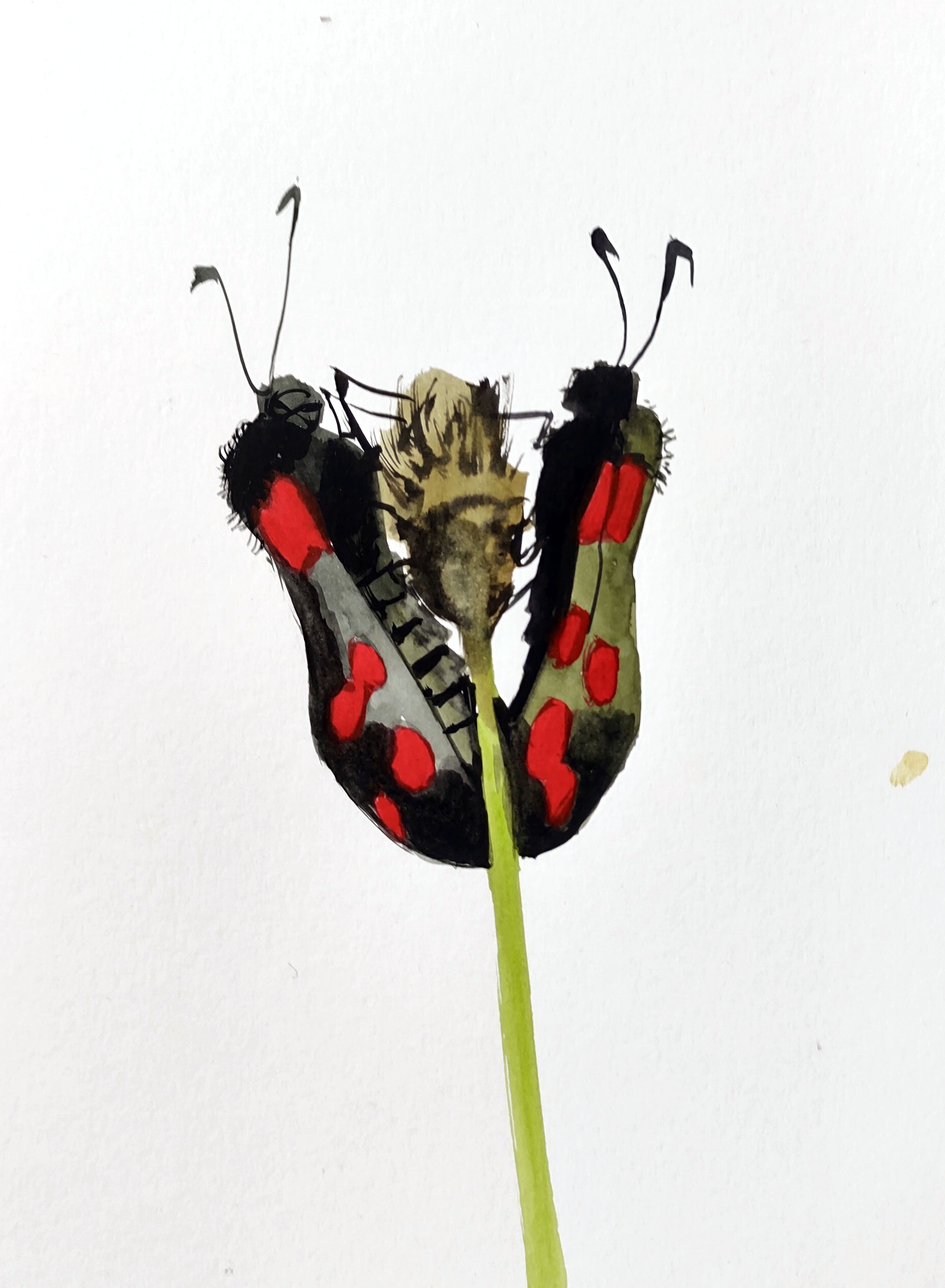 In the forest again, I walked along my old running route, reminiscing about times gone past. By the old running club, I stopped and painted a pair of six-spot burnet moths – obliging models that thankfully sat still, gazing into each other’s eyes, for a long while.