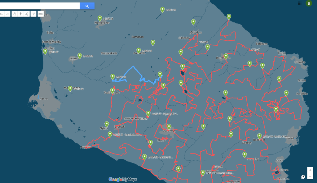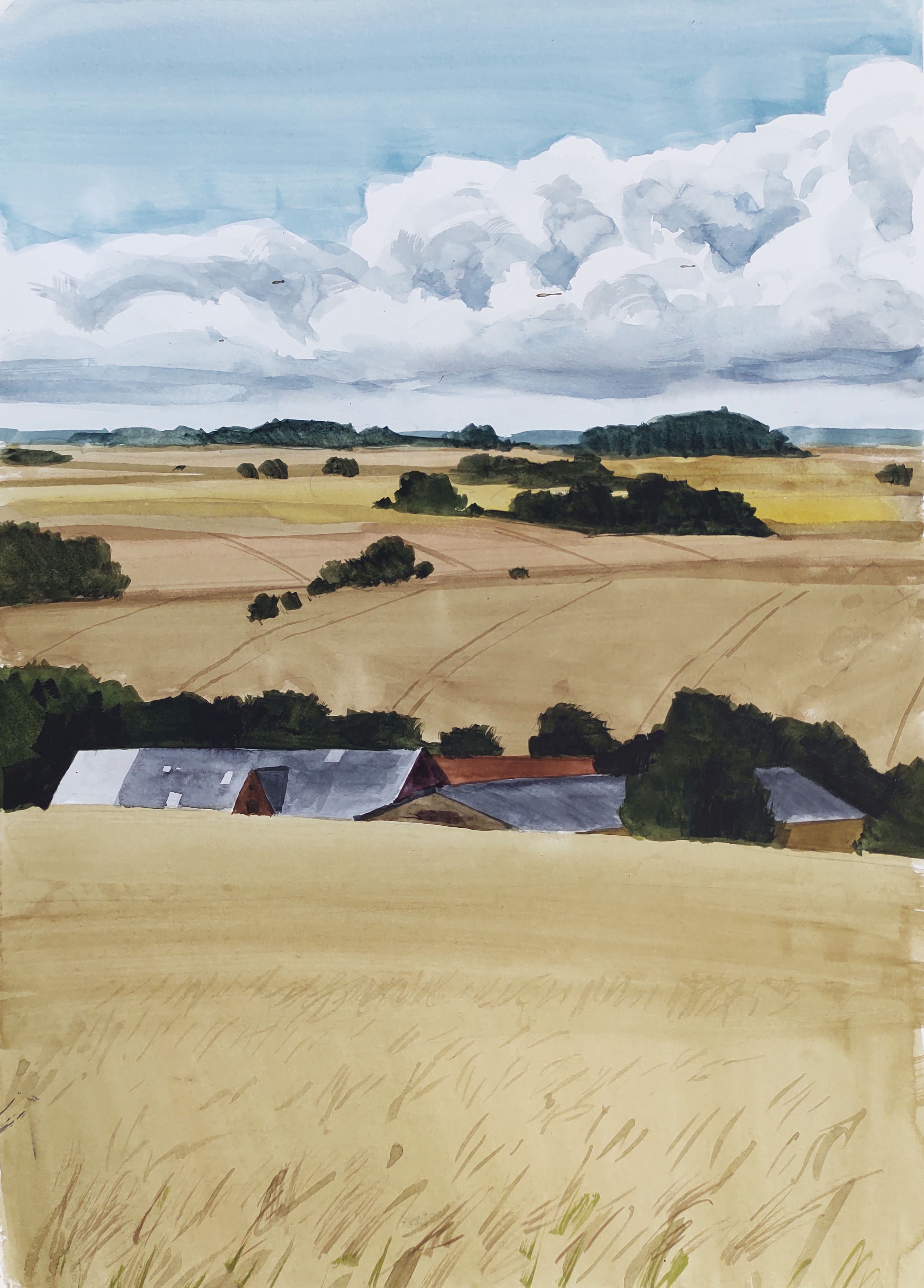 From here I crossed the main road and headed once more into Bornholm’s fieldscape. The narrow road was unmetalled and snaked through pea fields, filled with wildflowers, and visited by bouncing charms of goldfinch. I joined a larger road and enjoyed, for the first time during the LAND project, a view west, over rolling fields all the way to the sea – my LAND home for the next many months.