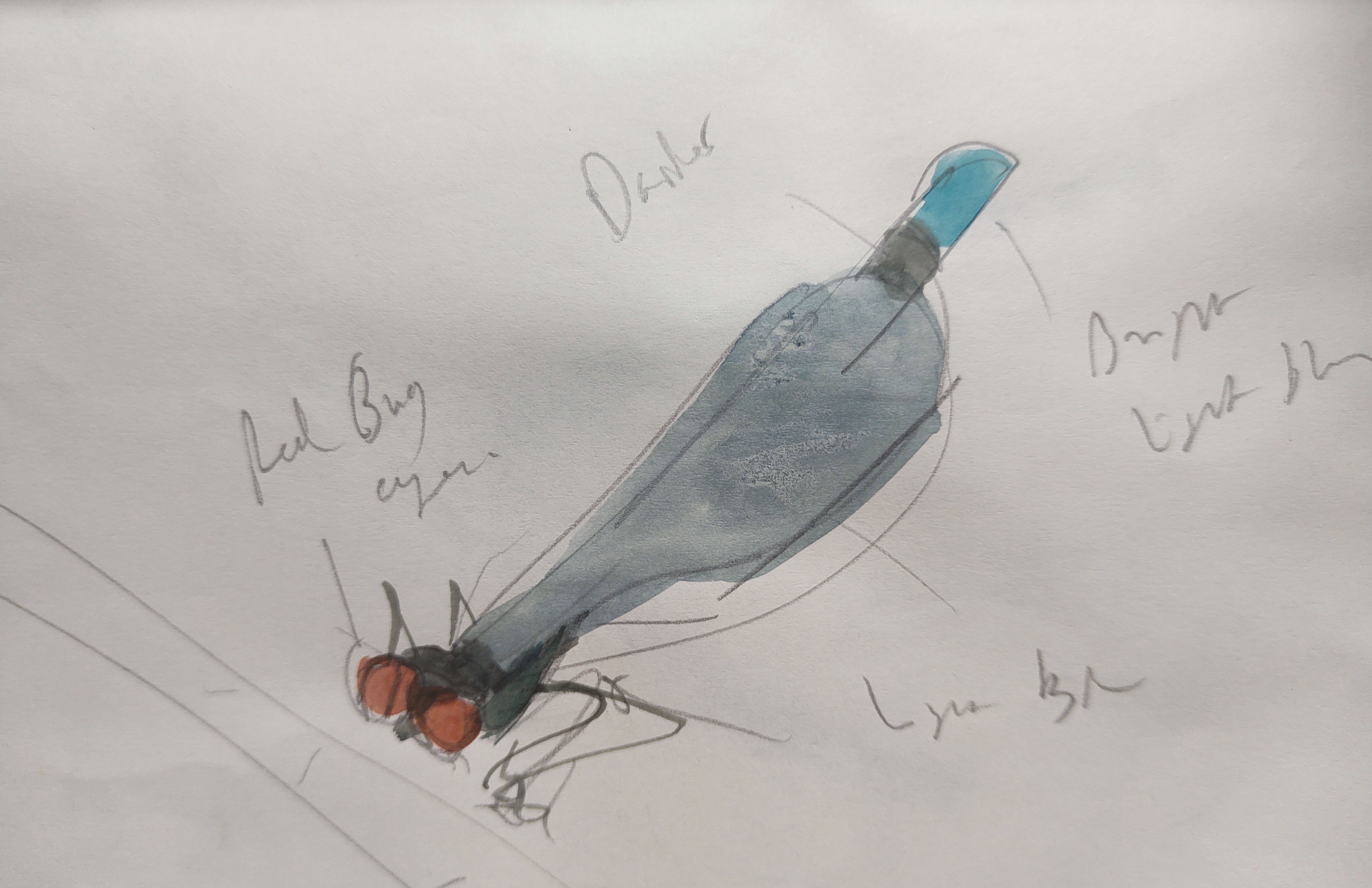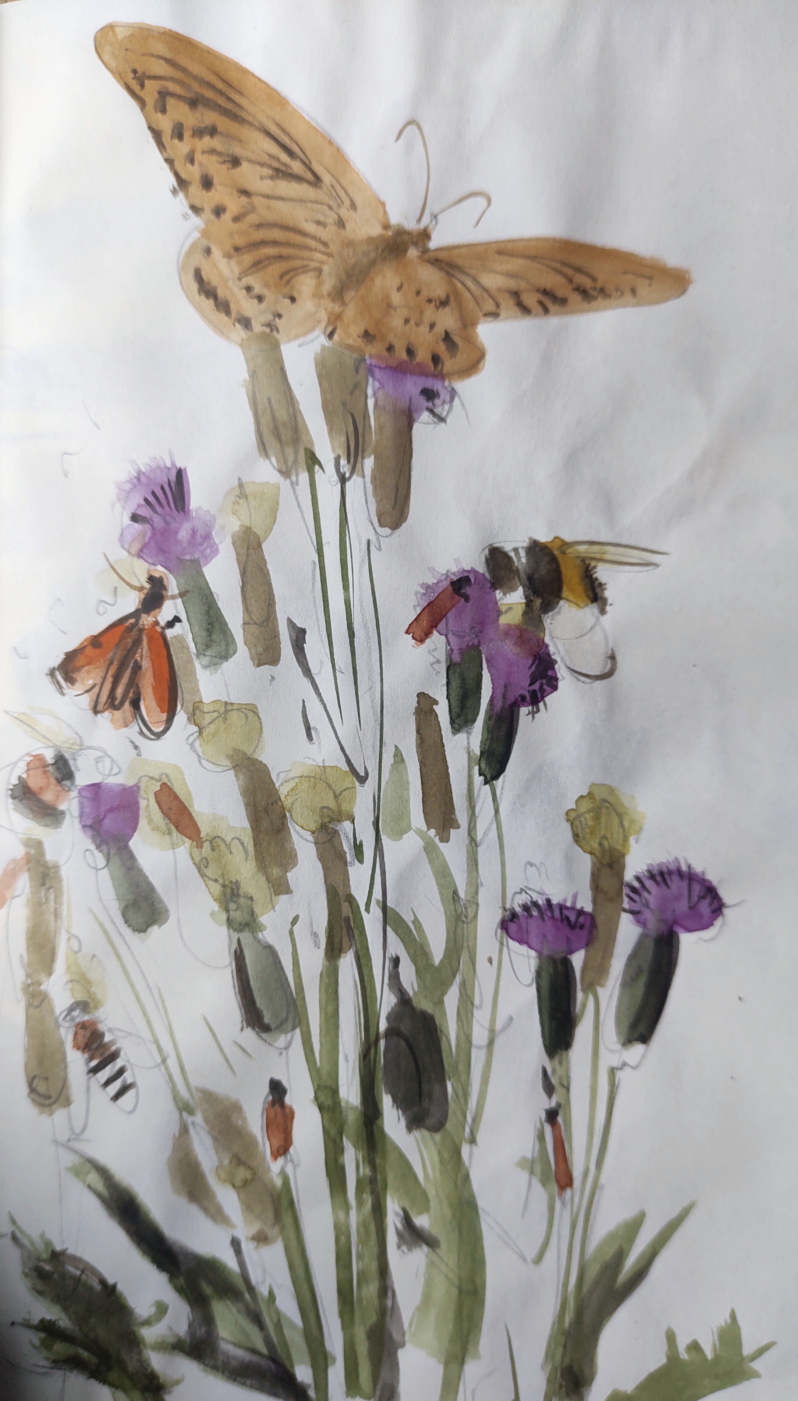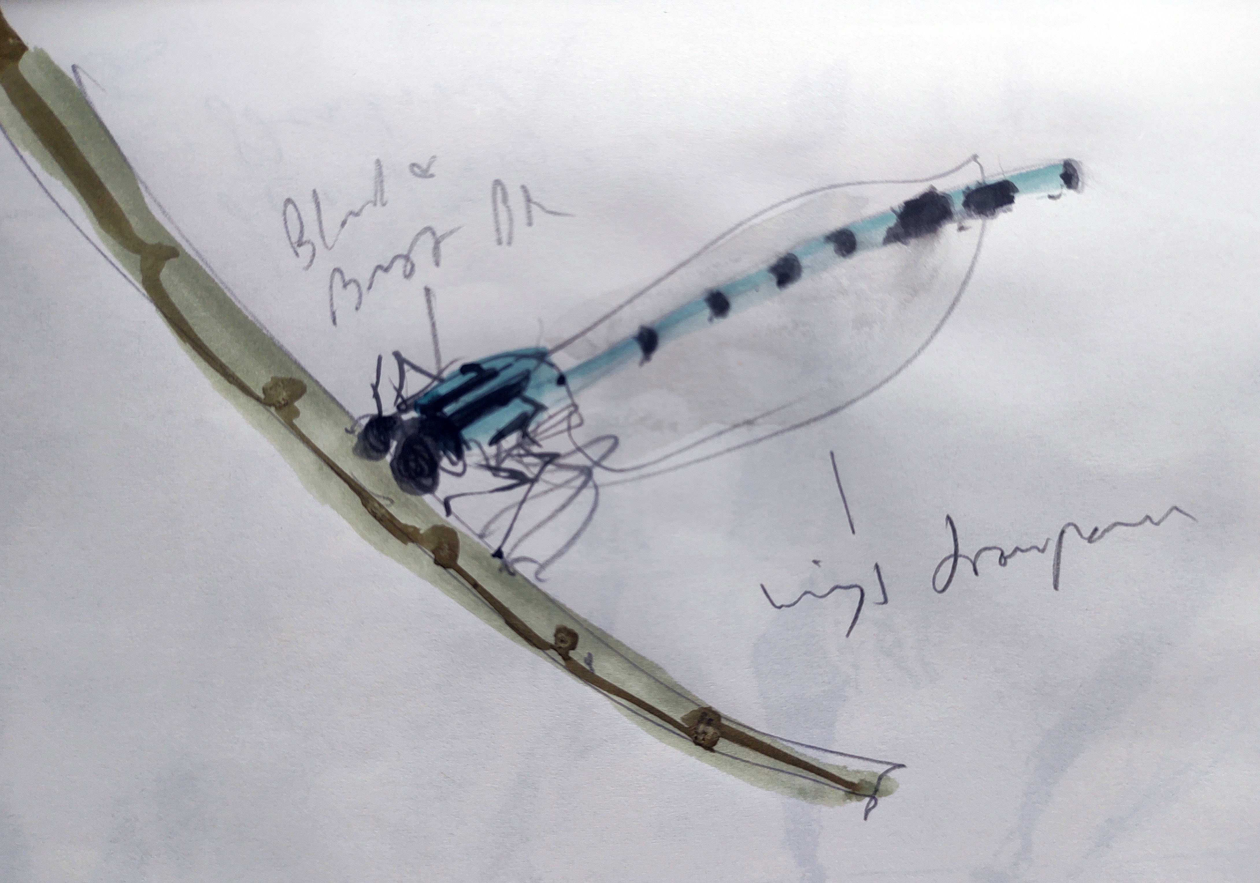 Later, in another short break from the rain, I made a few quick sketches of the damselflies skimming back and forth across the lake.