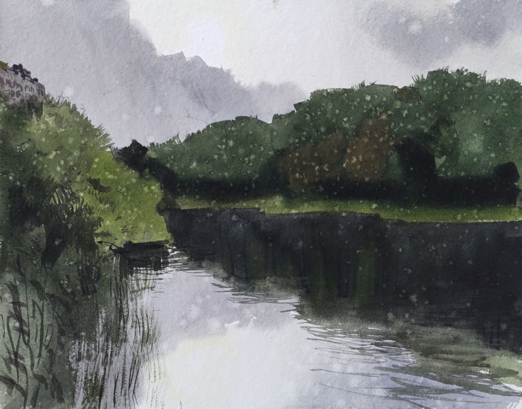 Later, after several hours sheltering under the tarp in a foul mood, I began to question the whole LAND project. I felt imprisoned by the rules and structure I had imposed on myself. By Lilleborg, an old castle ruin situated deep in the forest, I made a quick painting of the forest reflected in the moat, before the rain returned.