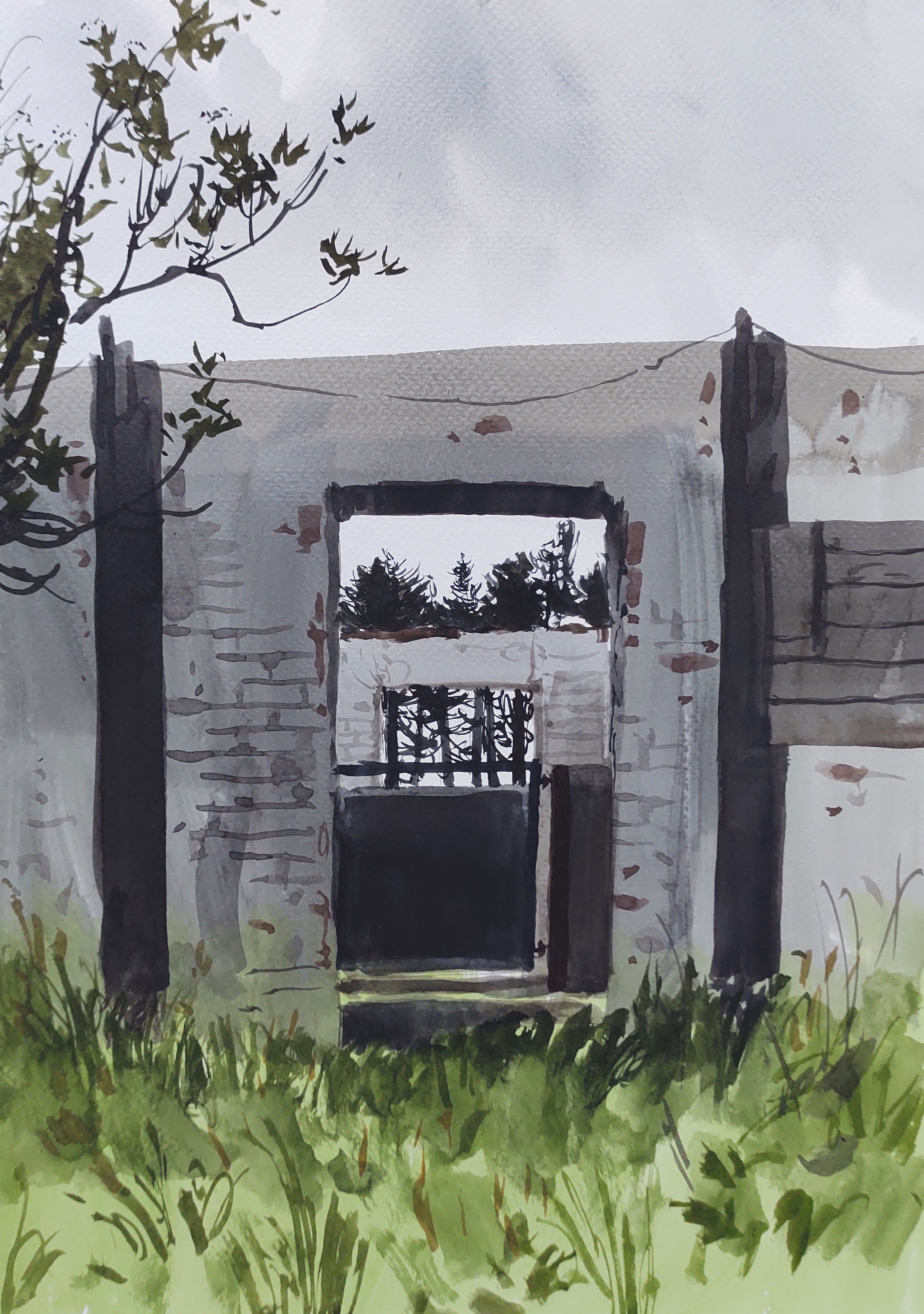 I walked on, skirting around Vestermarie, following some old bridle paths that I knew well, through rain-soaked beech woods and onwards through the fields. I ended up at Søgaard, a derelict old pig farm, currently utilised by ‘Hardball Bornholm’ as a venue for their military simulation battles. Lookout towers, piles of pallets, barriers, and sandbags were spread amongst the crumbling remains of the farm’s outbuildings. I walked around examining the old barns and equipment, recalling the sounds and smells of the old farm, home to generations of farmers.