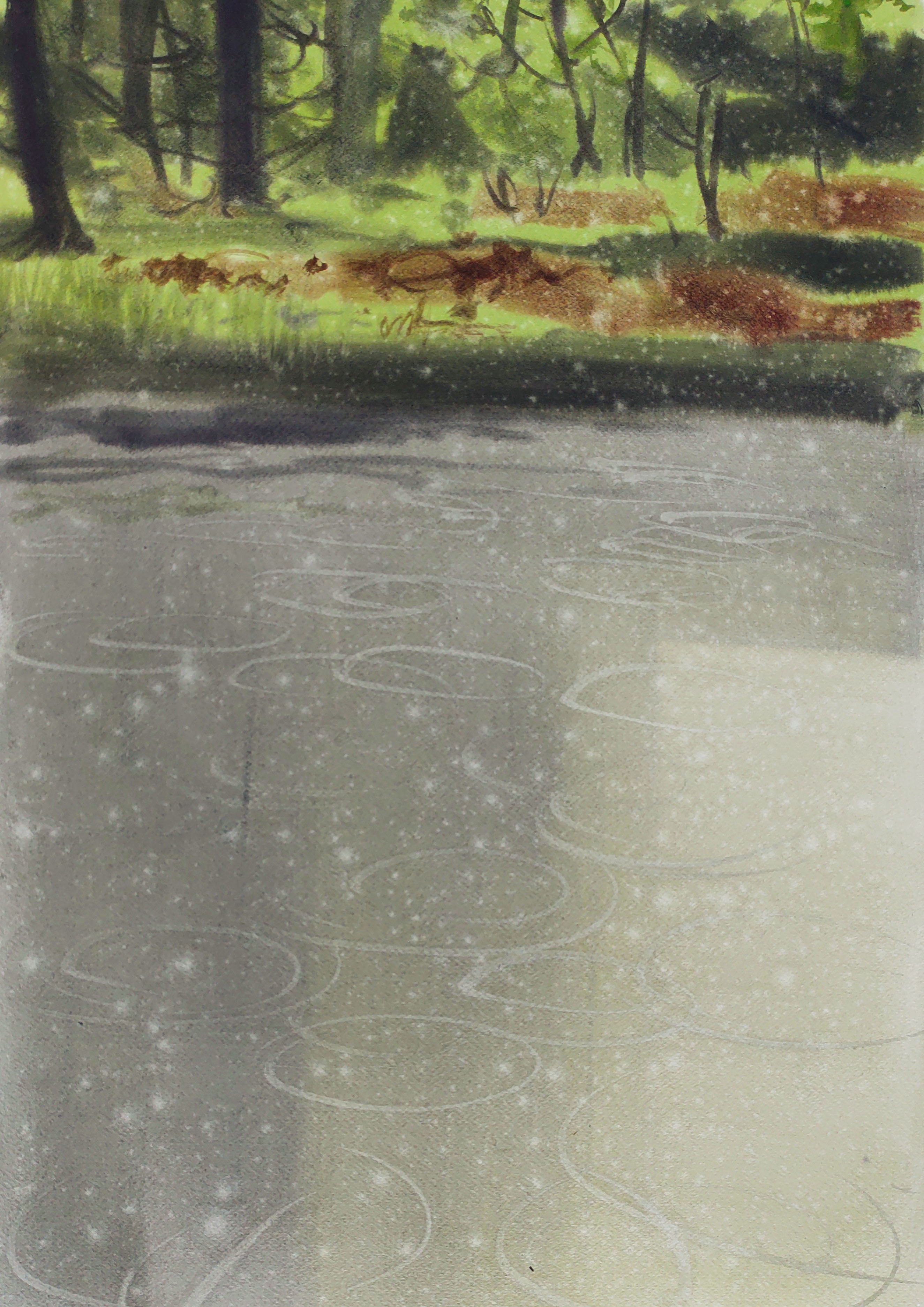 LAND 30 Dazed and confused I welcomed the new dawn at Bjergbakke. Six hours earlier my family and I had finally arrived on Bornholm after a quick three-day visit to England for a big party. I was exhausted and unprepared – and annoyed that I had pushed the LAND Day again. I could feel the project unravelling, the parameters keeping it all together were beginning to dissolve. In my rush I had forgotten to pack several key items and, once again, I was forced to focus on the walk, the experience, and the ‘red line’ – and not the painting.
