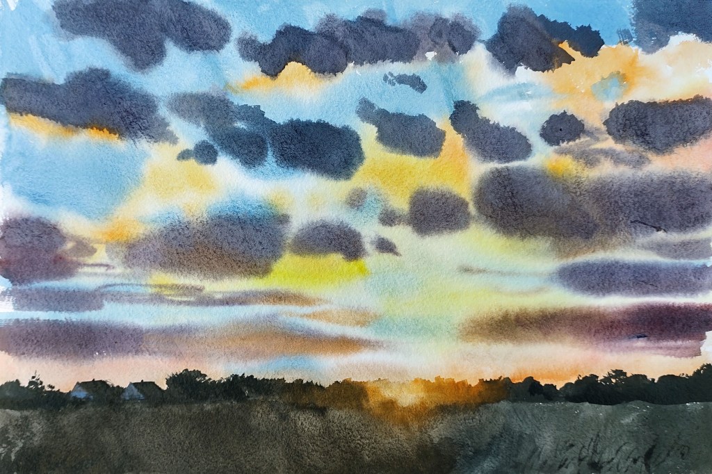 LAND 32 Crimson and orange flecks in the highest cirrus clouds promised an exciting sunrise as I arrived back at Knuds church at dawn. It was a little chilly, but I found some shelter from the wind and tried to capture the kaleidoscope of colours as they continually altered in hue, value, and intensity.