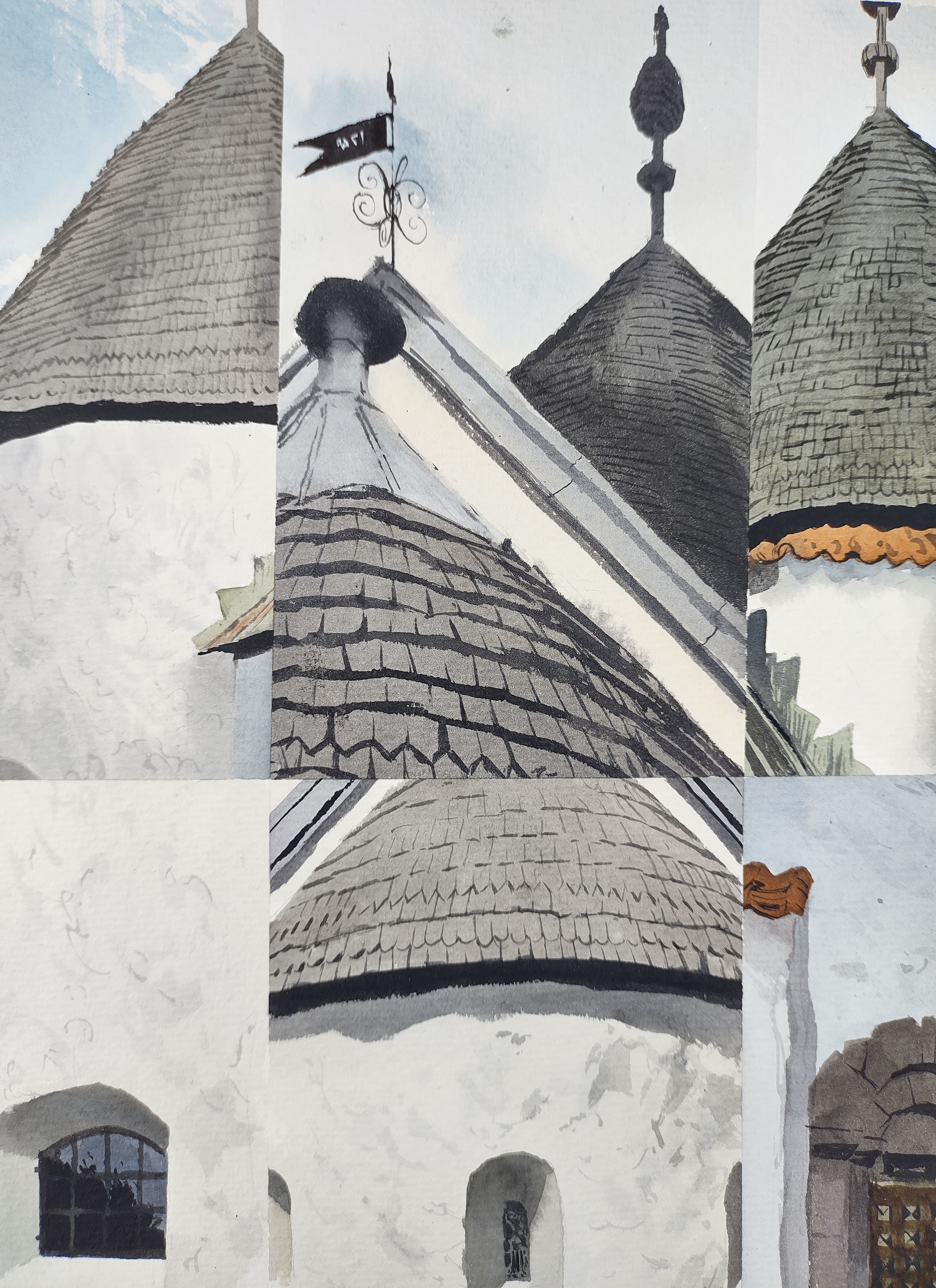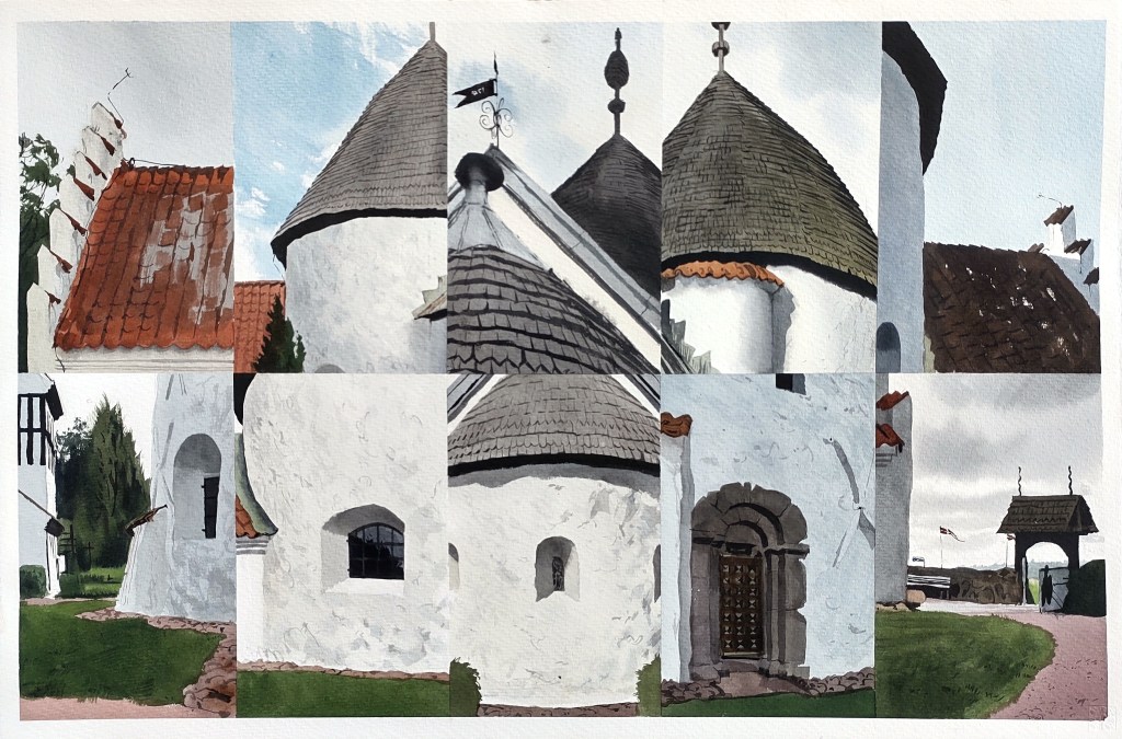 The spectacular sunrise I had hoped for never materialised. Instead, a dull grey blanket of clouds and a blustery east wind. I had wanted to make a ‘slice painting’ of the church, but the light was rather static and unchangeable. Additionally, I found it really difficult to ‘contain’ the shape of the church within the frame of the paper and could not decide on a suitable viewpoint. I decided to walk around the church and make several studies from different viewpoints hoping that in the end the overall effect would be a more faithful reflection of the circular and three-dimensional reality of visiting and looking at the round church.