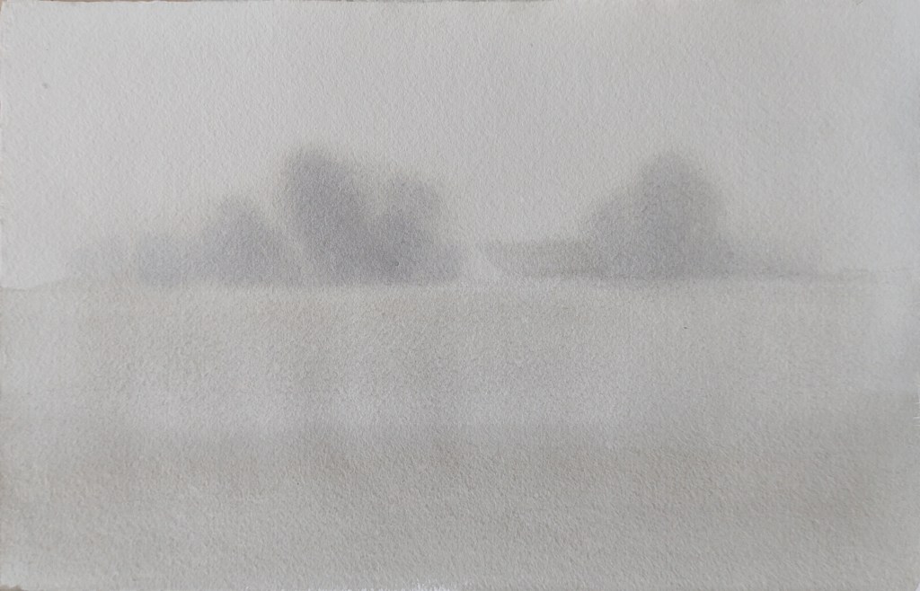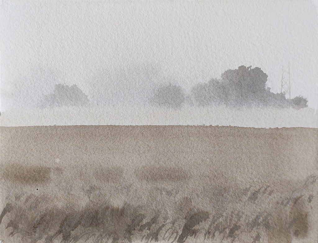 The landscape was hidden from me, and I walked alone through the milky mist, stopping every now and then to try to paint the ghostly shapes. In comparison to the morning’s hyper-detailed painting, these could not have been more different both in execution and result.