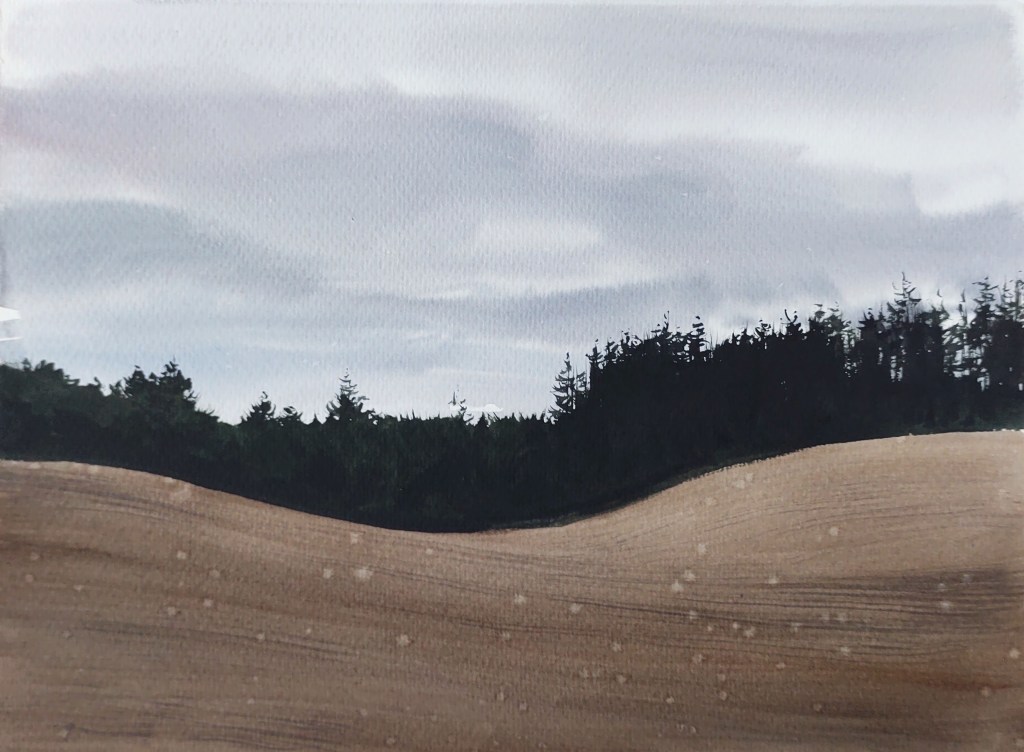 LAND 34 Dawn at Aarsballe. The thick fog of last week was gone, revealing an undulating agricultural landscape with dark, heavy soils. The pewter grey skies were almost imperceptibly tinged with the subtlest rose, the only hint of the sun rising behind the thick layer of clouds.