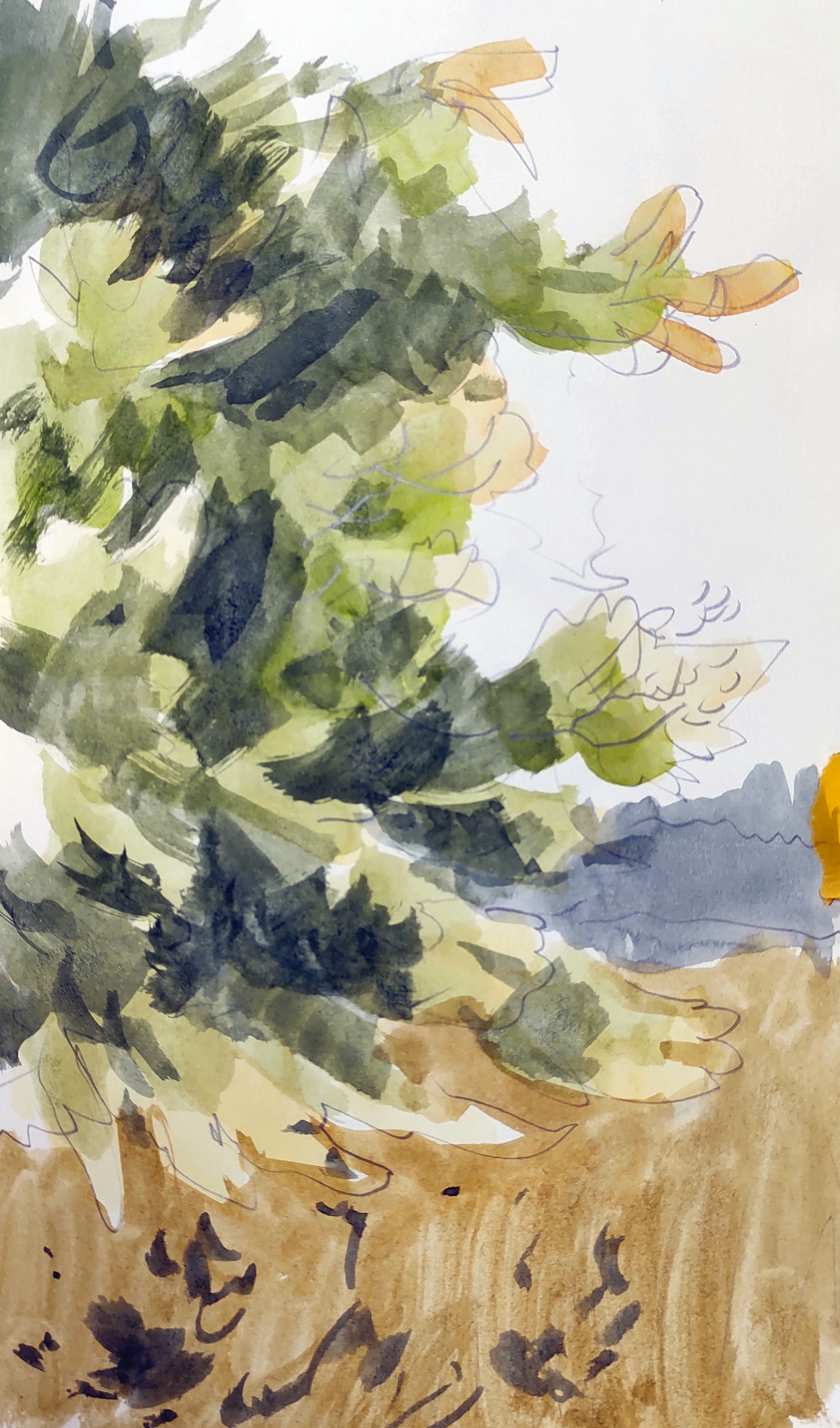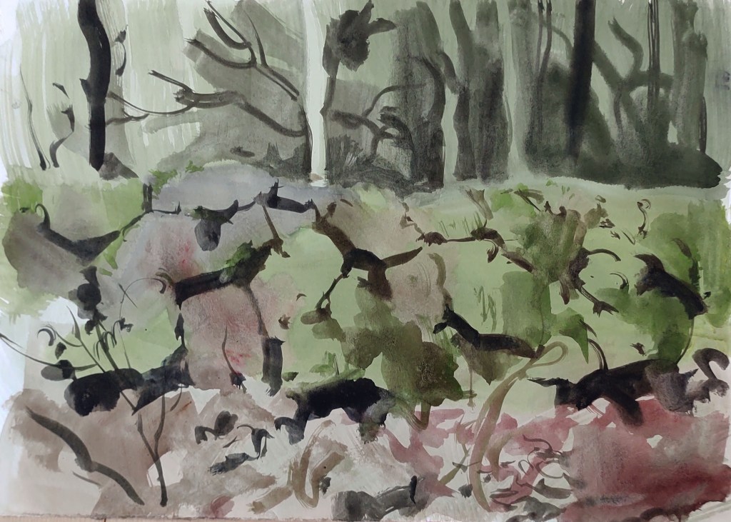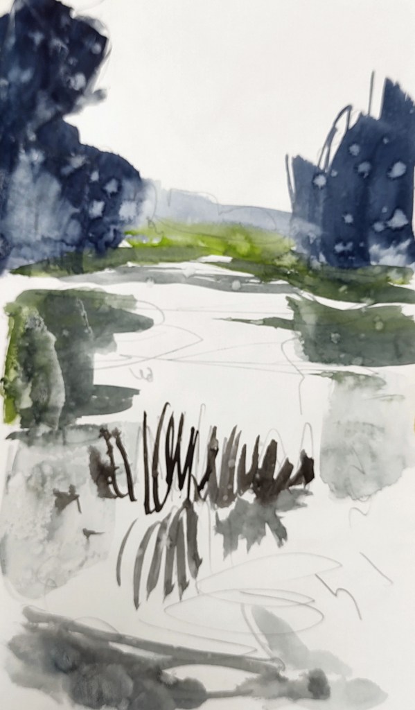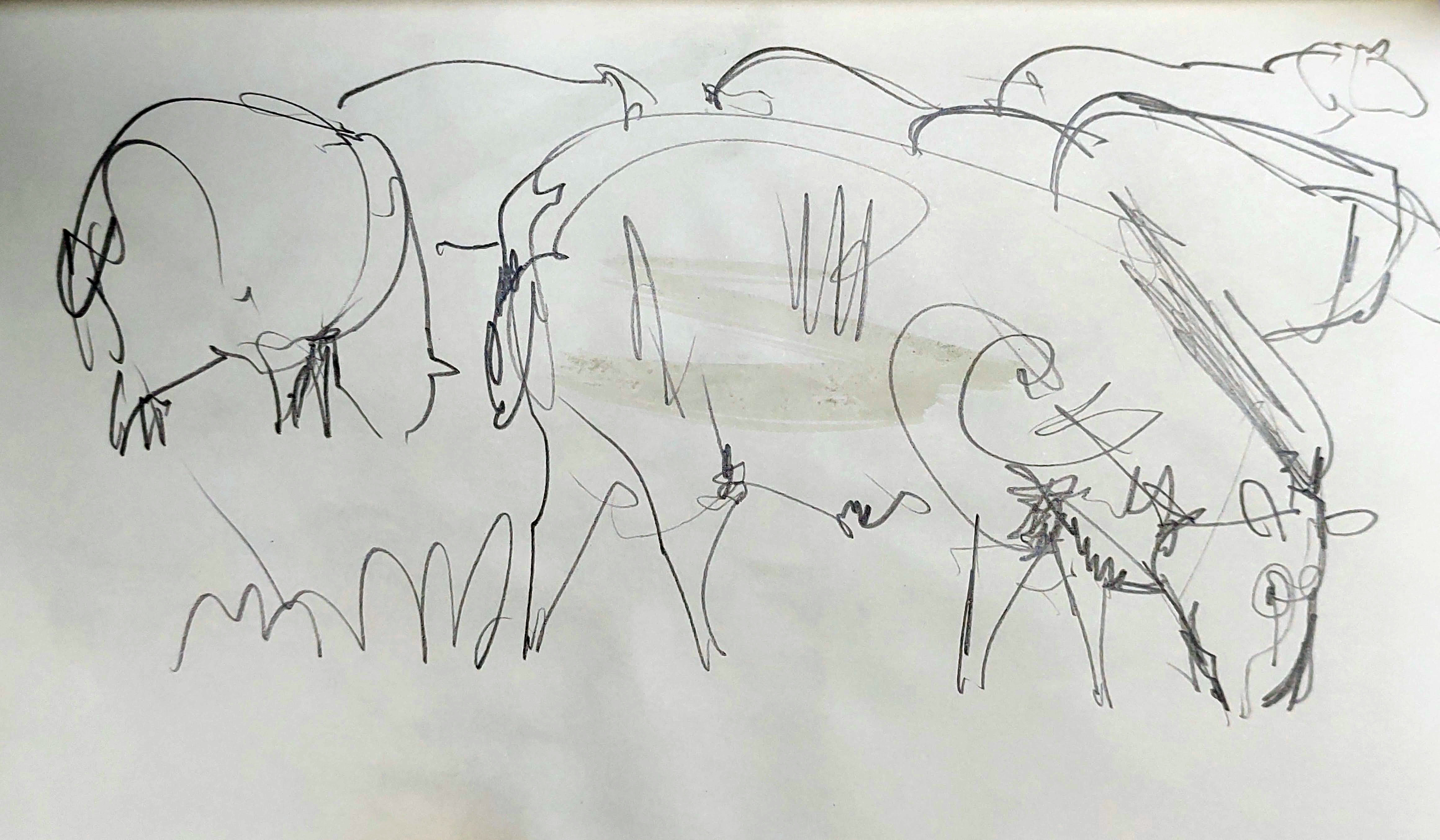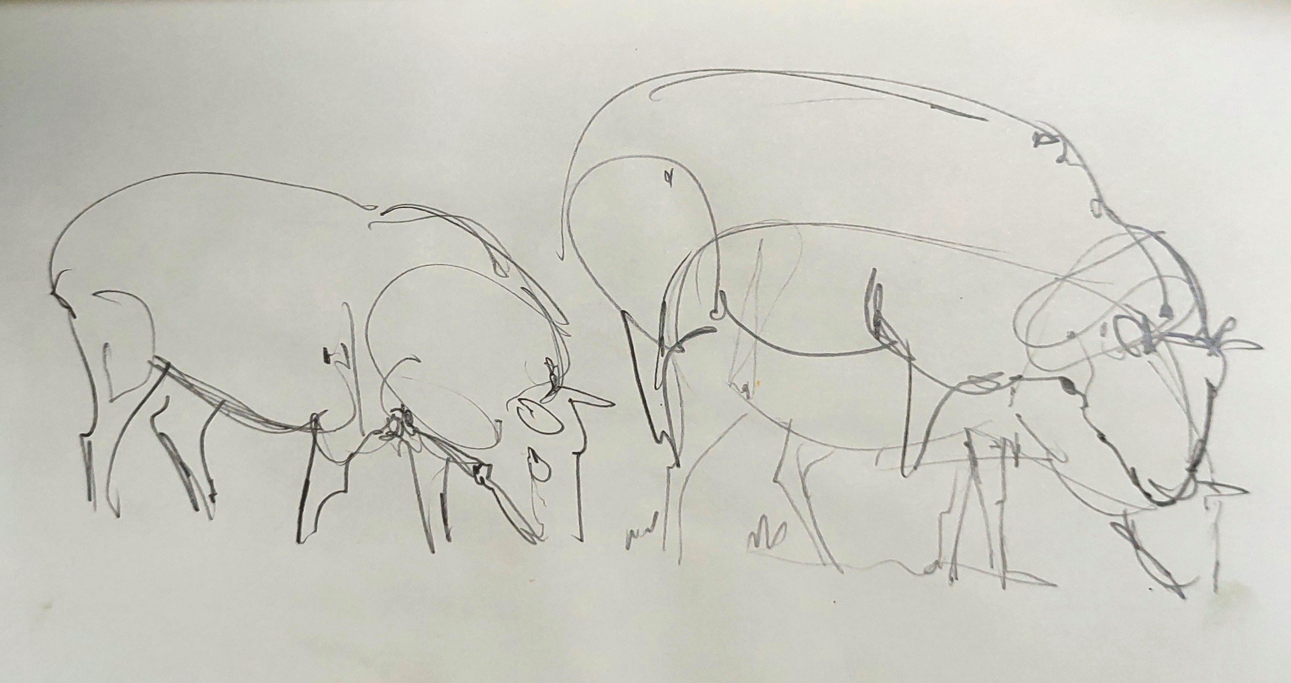I carried on, exhausted now from all of the cross-country tramping. Close to the road, I tried to draw some sheep grazing in a large paddock.