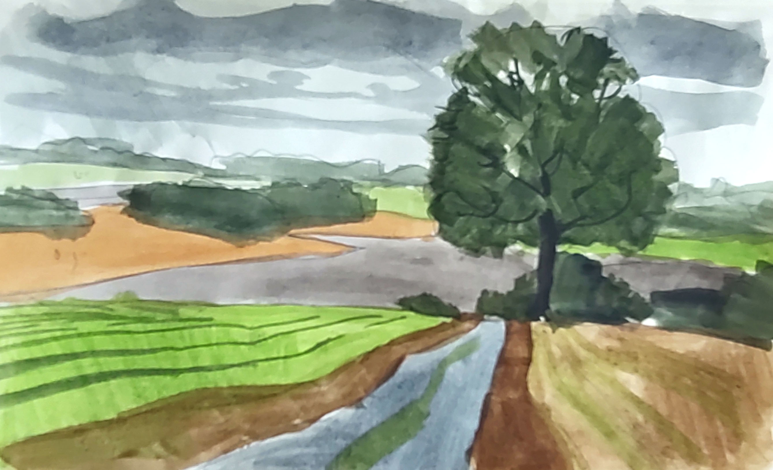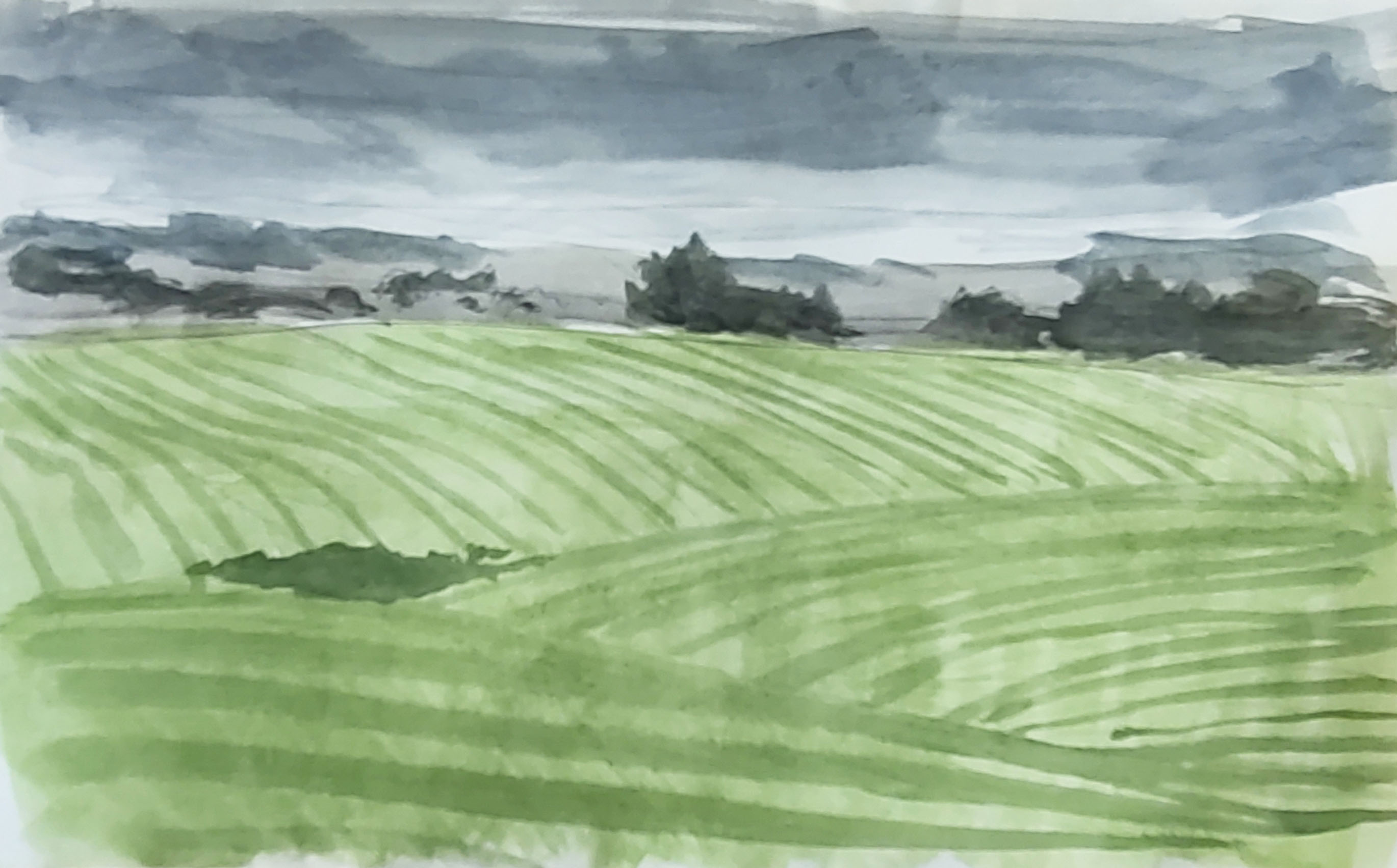 The rolling landscape was a complicated tapestry of colour and pattern. Many fields had been recently cut for silage, leaving bright milky-green stripes. Others still contained browning maize, while some were bright orange after being treated with some sort of chemical. The rain, clouds, and sun came and went.