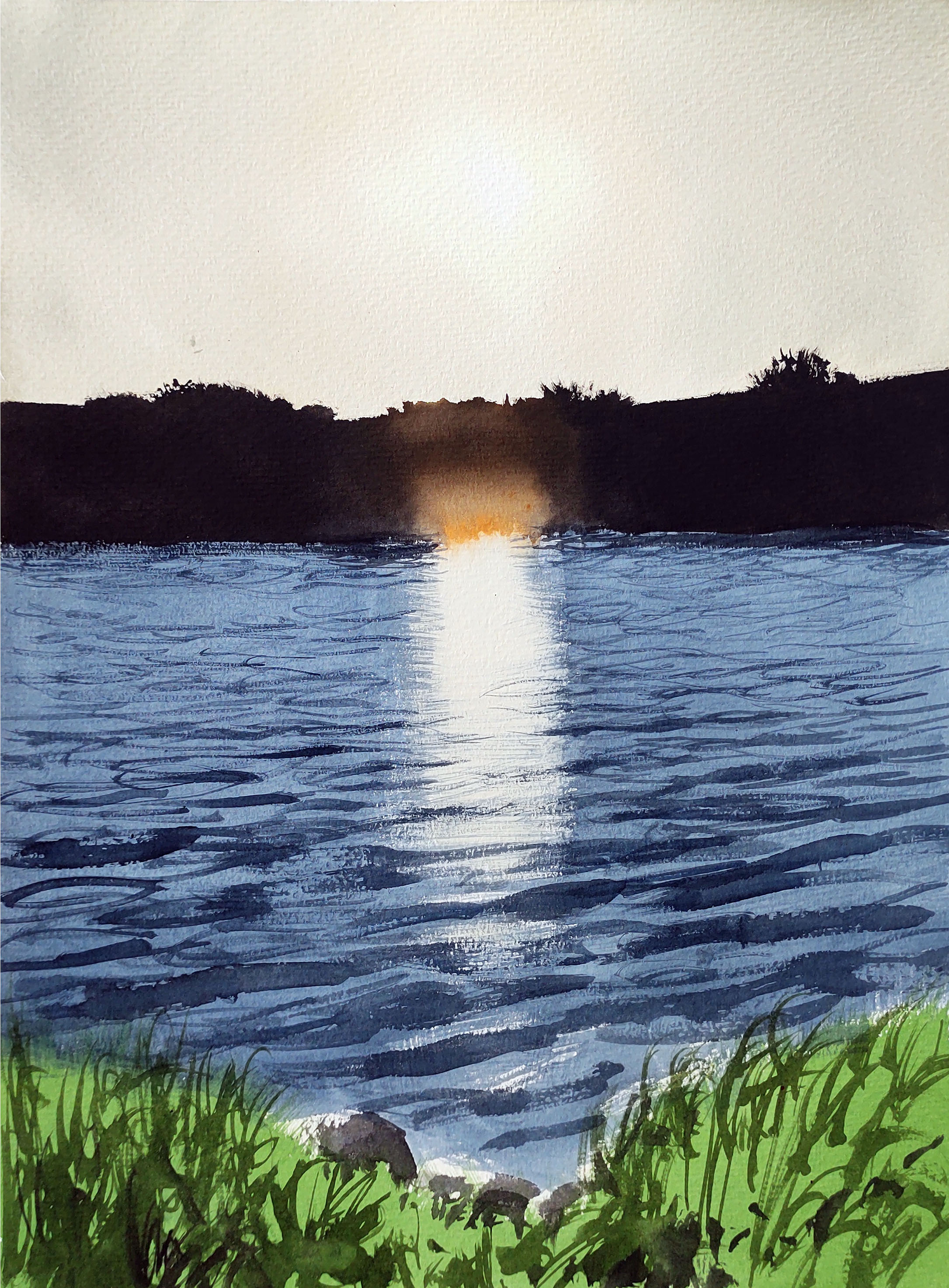 Time was running out, the shorter days are really becoming noticeable now. I walked along the old railway track connecting the village of Klemensker with Rønne and Allinge, now a cycle track. Here, looking across the waters of Dammemose, I painted the setting sun.