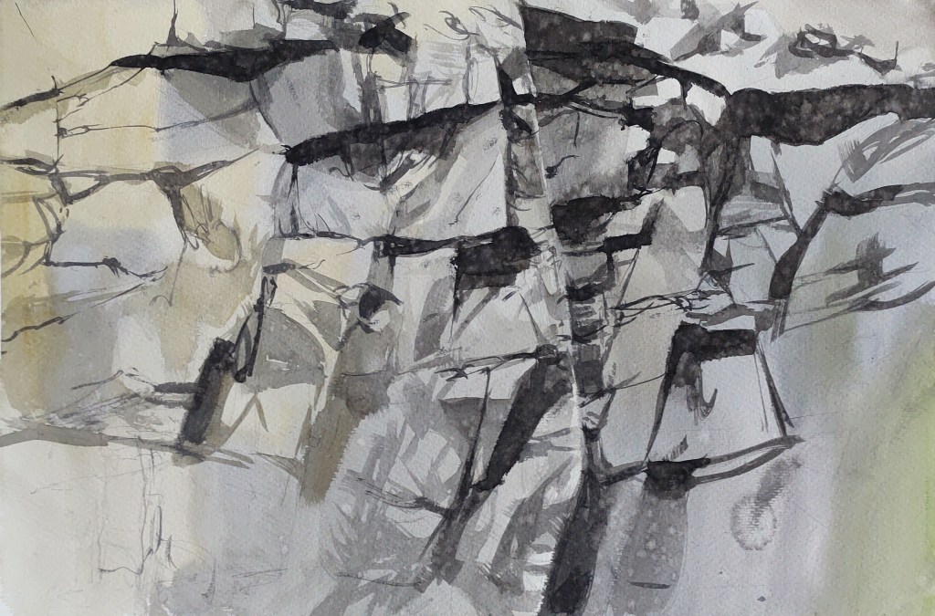 Again, I was seduced by the intricate and savage shapes and structures of the vertiginous granite quarry walls and decided to really get into them, although I knew time was already running away from me. After an hour or so, however, the wind started to pick up, and before long it started spitting. I tried to cover the paper as best I could but was ultimately forced to seek refuge in an old quarry building, recently converted into a fine shelter.