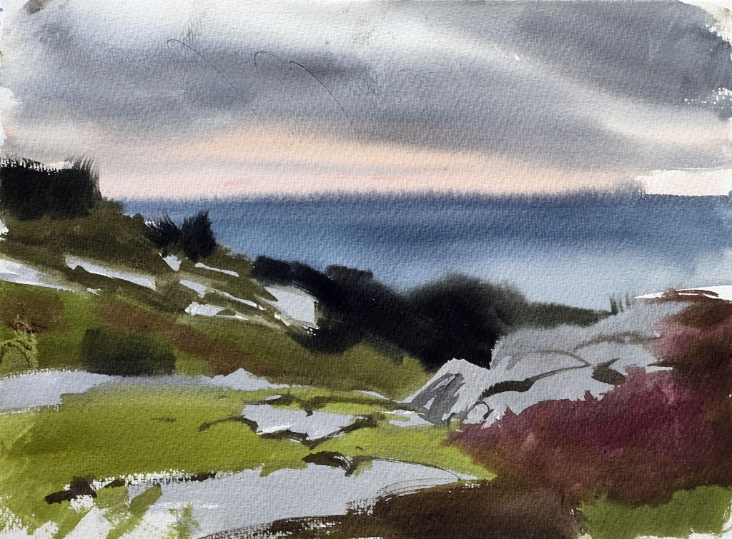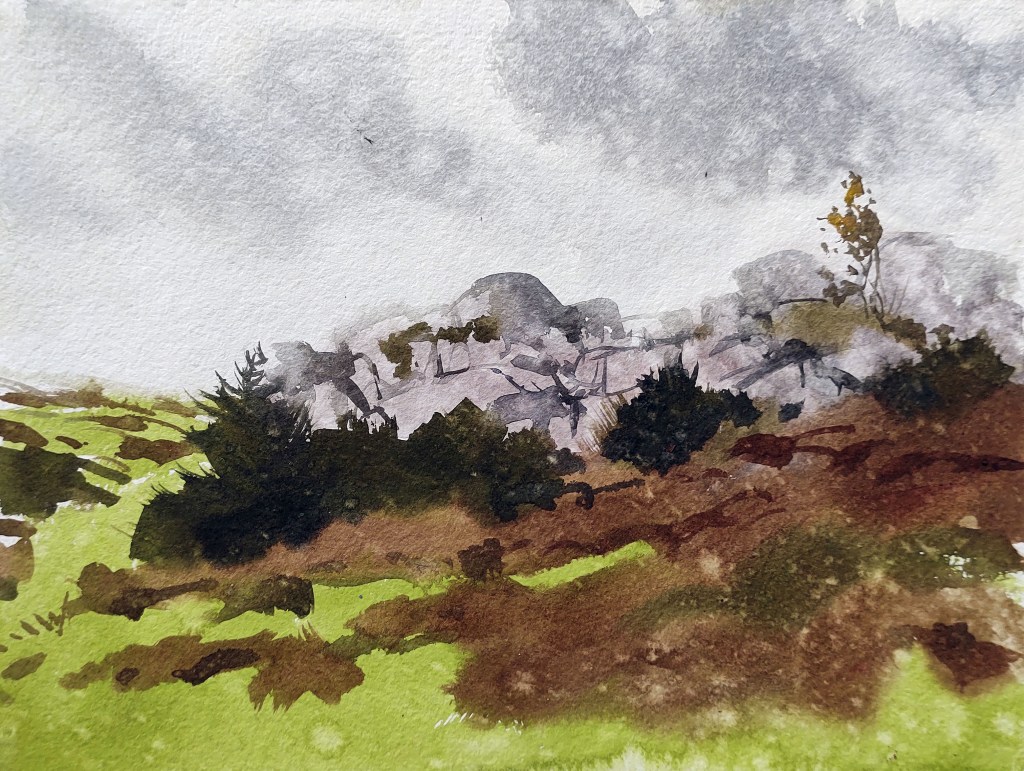 Eventually the rain lessened in intensity, and I walked on, through the village of Vang and onward to Finnens Top and Slotslyngen. I had long been looking forward to wandering around and painting in this area, but the weather had other plans. Once again, I was forced to take shelter, this time under my tarp, as the wind and rain built up again. I tried to paint the exposed granite, heather, and juniper typical of the region, but was buffeted and beaten by the wind and rain and soon everything was a wet soggy mess.