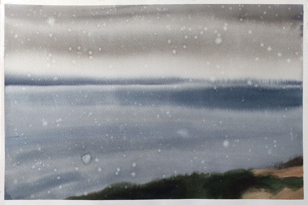 The rain increased in severity, and I was trapped. I tried looking through the rain and painting the quarry. Birch trees were already changing colour to yellow.
