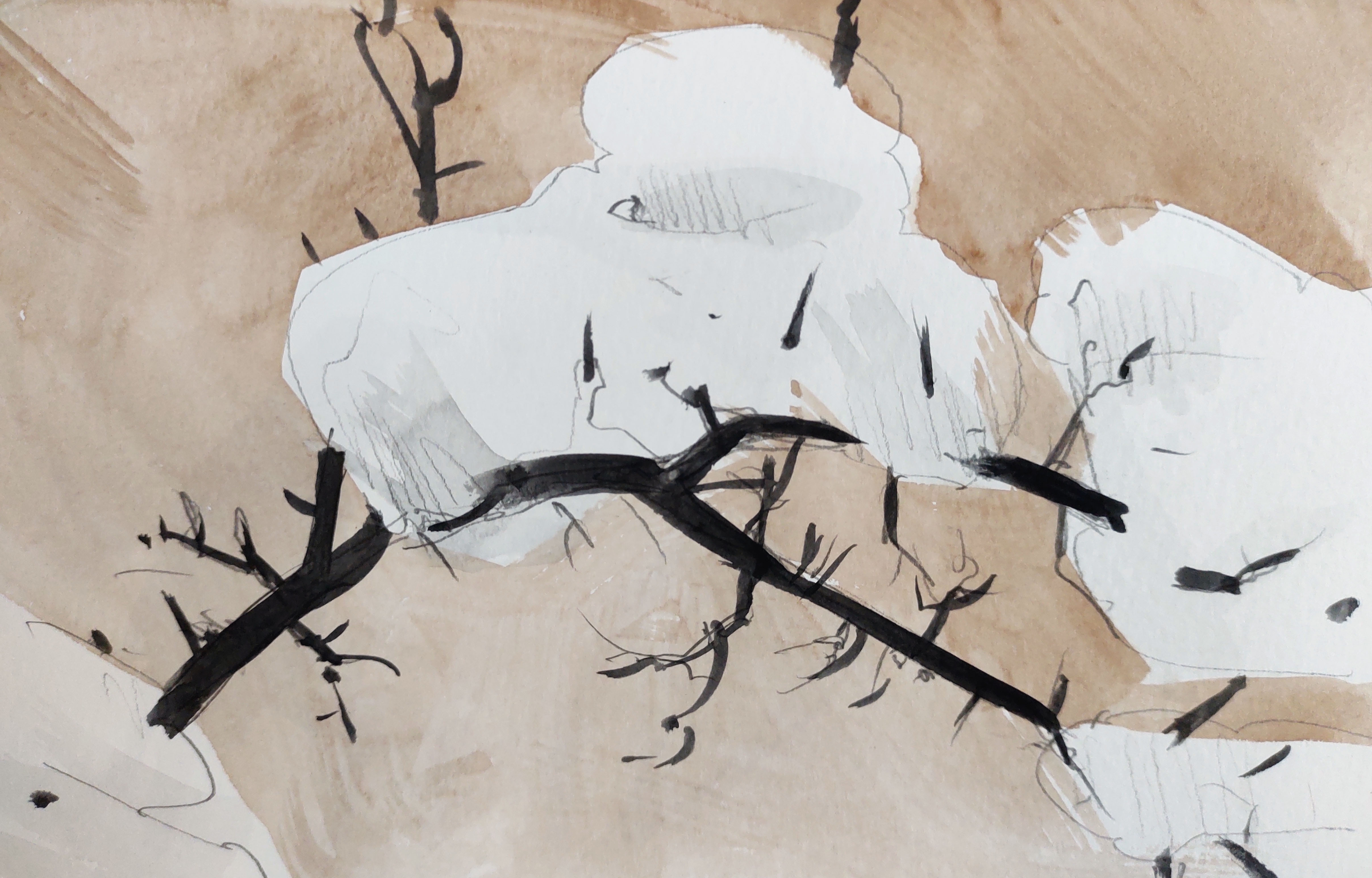 I continued through the plantation, first heading west and then north. The snow had created a minimalist universe of grey, umber, and sepia. What colours there were – the reddish copper beech leaves, or the yellow-ochre birch trunks – were thus made more intense.