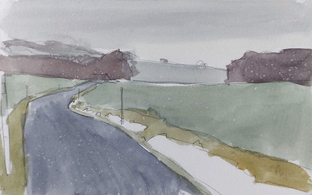 LAND 50 Cold, wet and grey – the cloud cover so thick that it was difficult to really know whether the day had started. I walked up the hill away from the coast and then headed southeast, looking back towards the sea. The snow had mostly disappeared, with just a few bright stripes remaining in ditches and roadside verges.