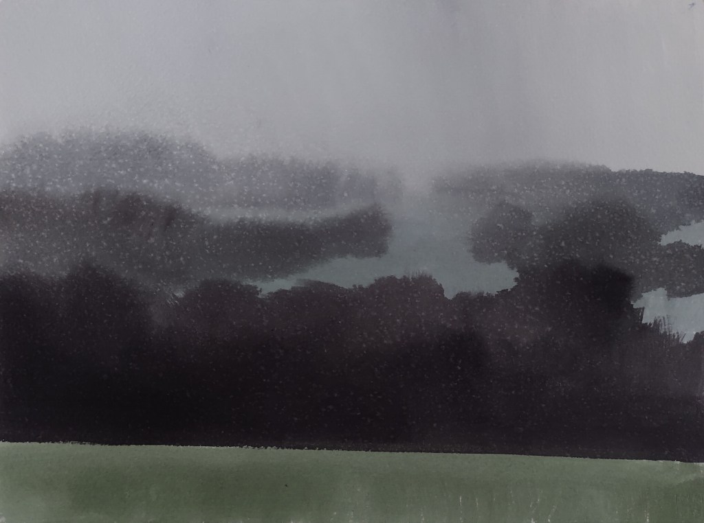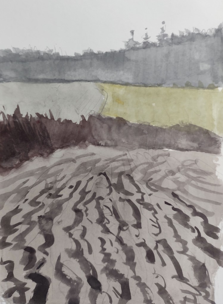 This was a reduced landscape without sharp edges, of mid-tones and pastel greys. Visually it was fascinating and beguiling, but I struggled with the fine drizzle and gusting wind. Somehow, I had forgotten my gloves and every time I tried to paint my fingers froze, and my gear got even more wet.