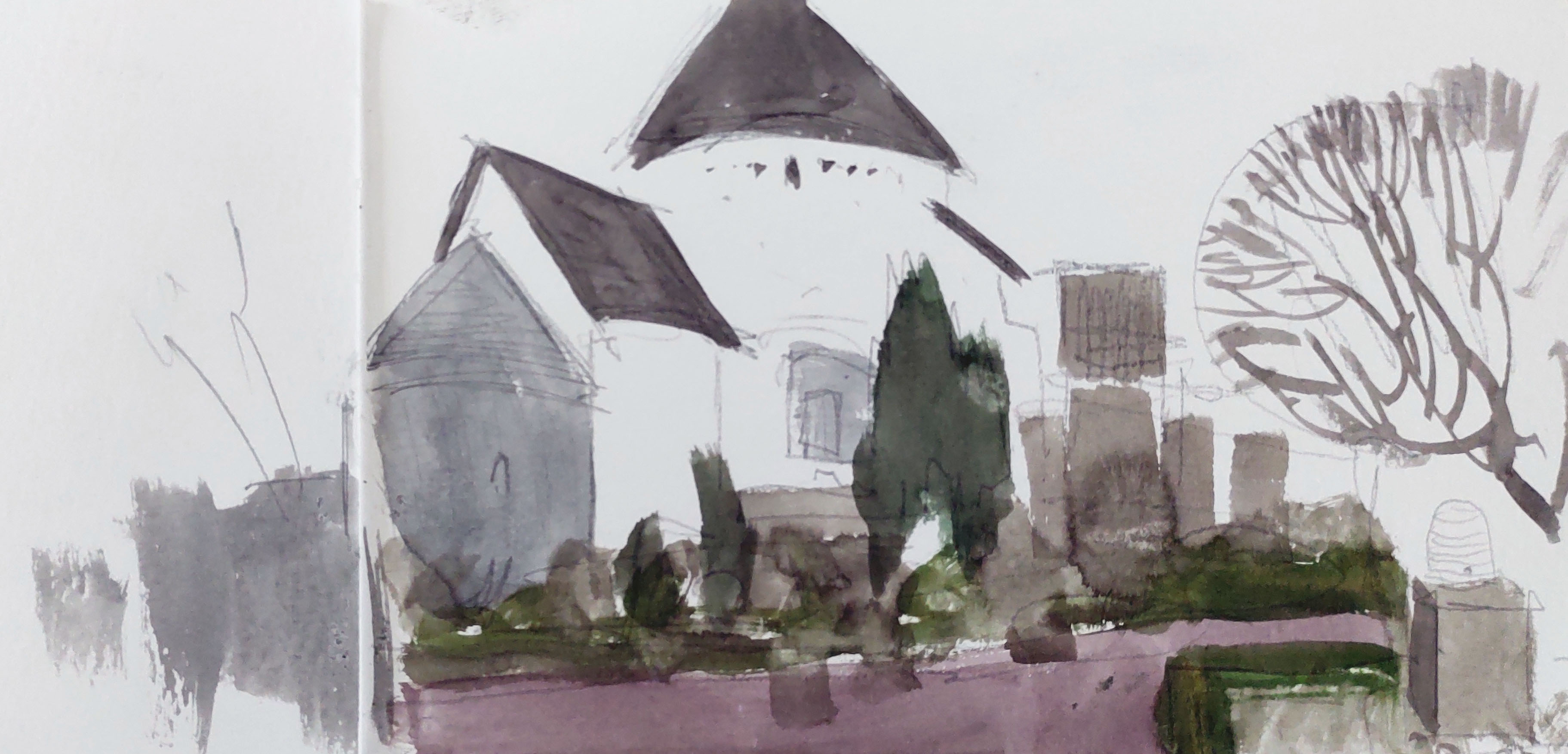 The largest, oldest, and most imposing of the island’s four round churches, Østerlars church has an agreeably stout and curvaceous profile, framed and supported by seven huge, angled buttresses. The whole site was, as ever, immaculately maintained and ordered, and I explored the graveyard for a while, before settling down and making one last painting in the gloom, as the day passed imperceptibly into night, and I was done.