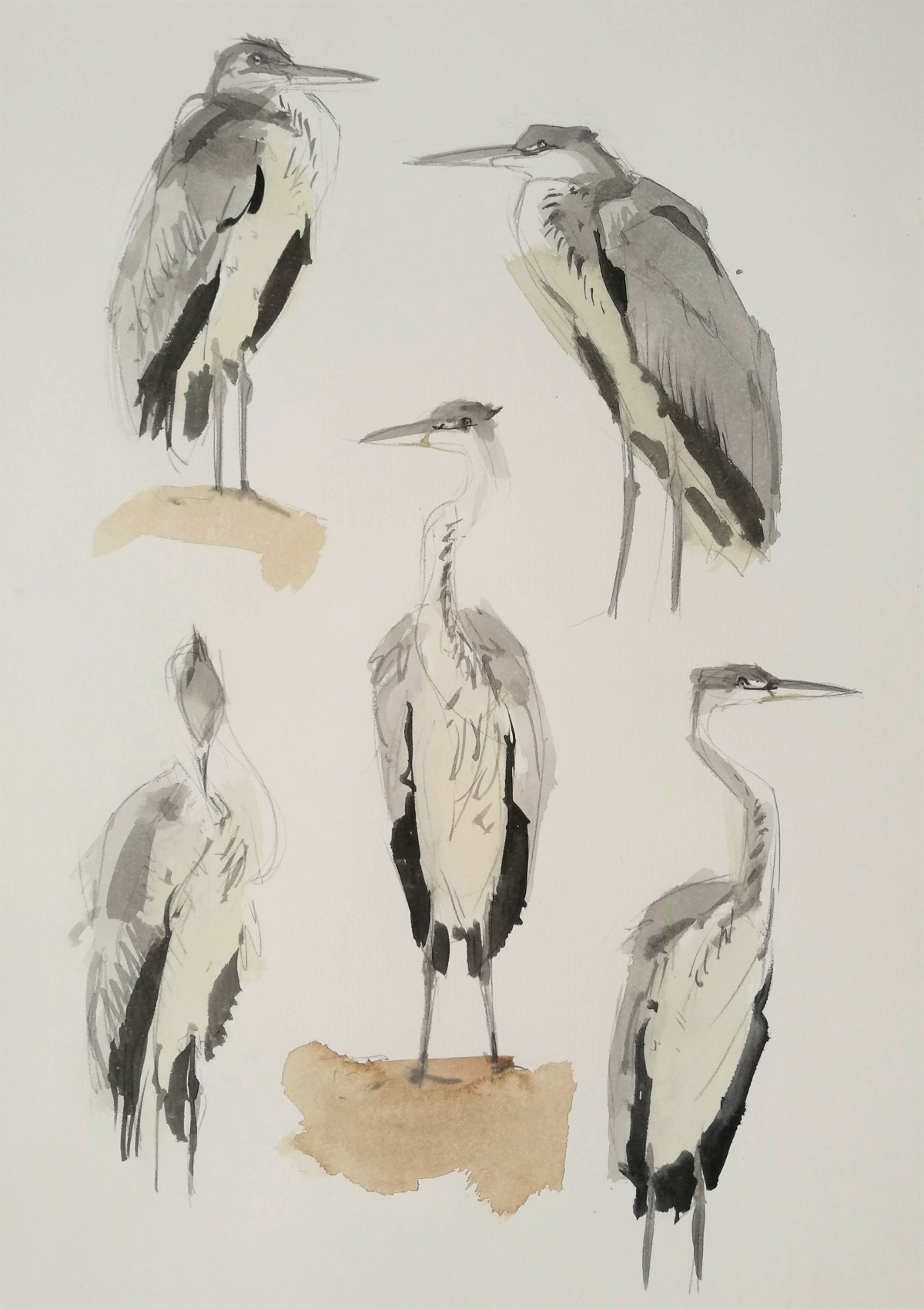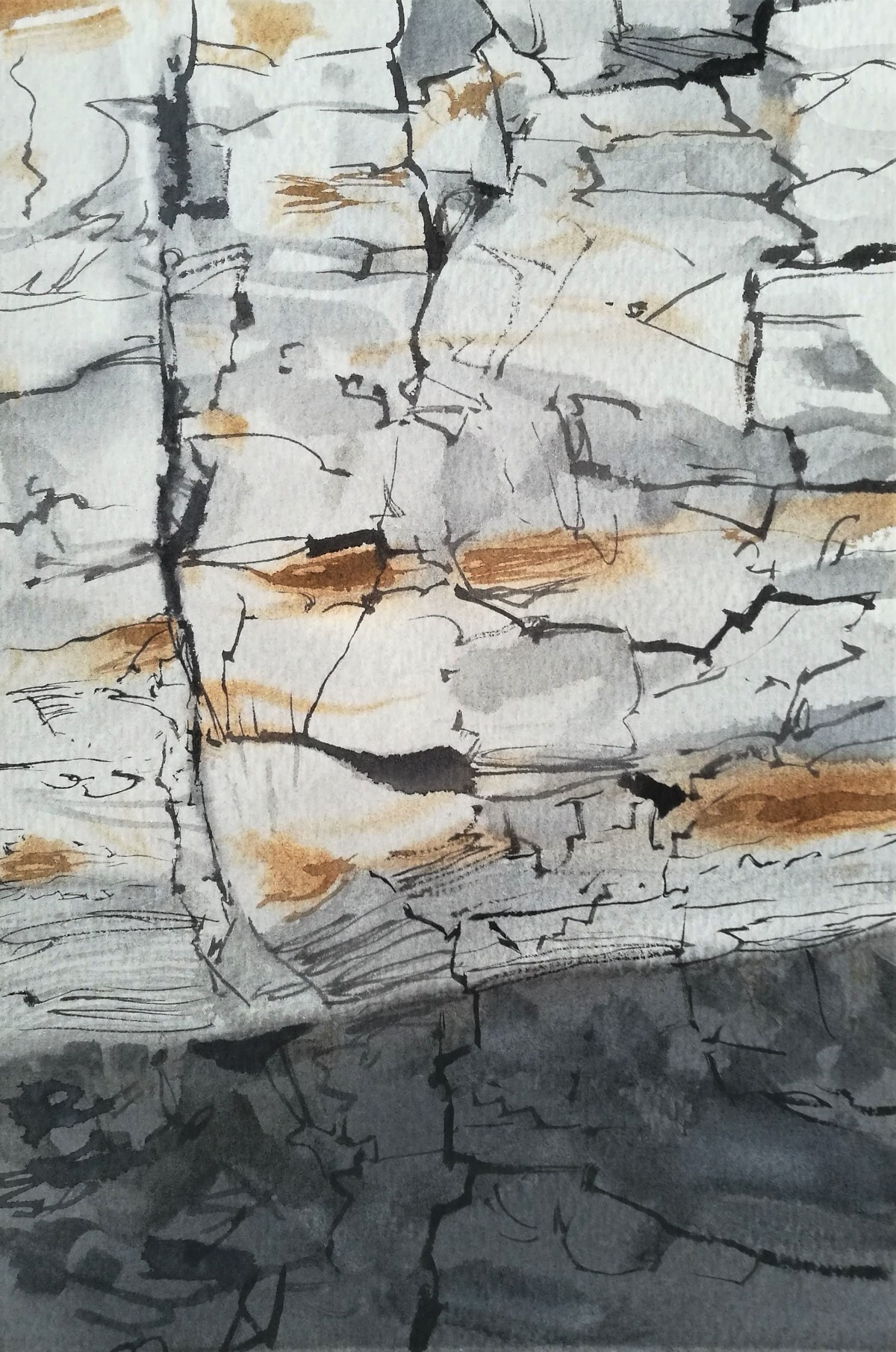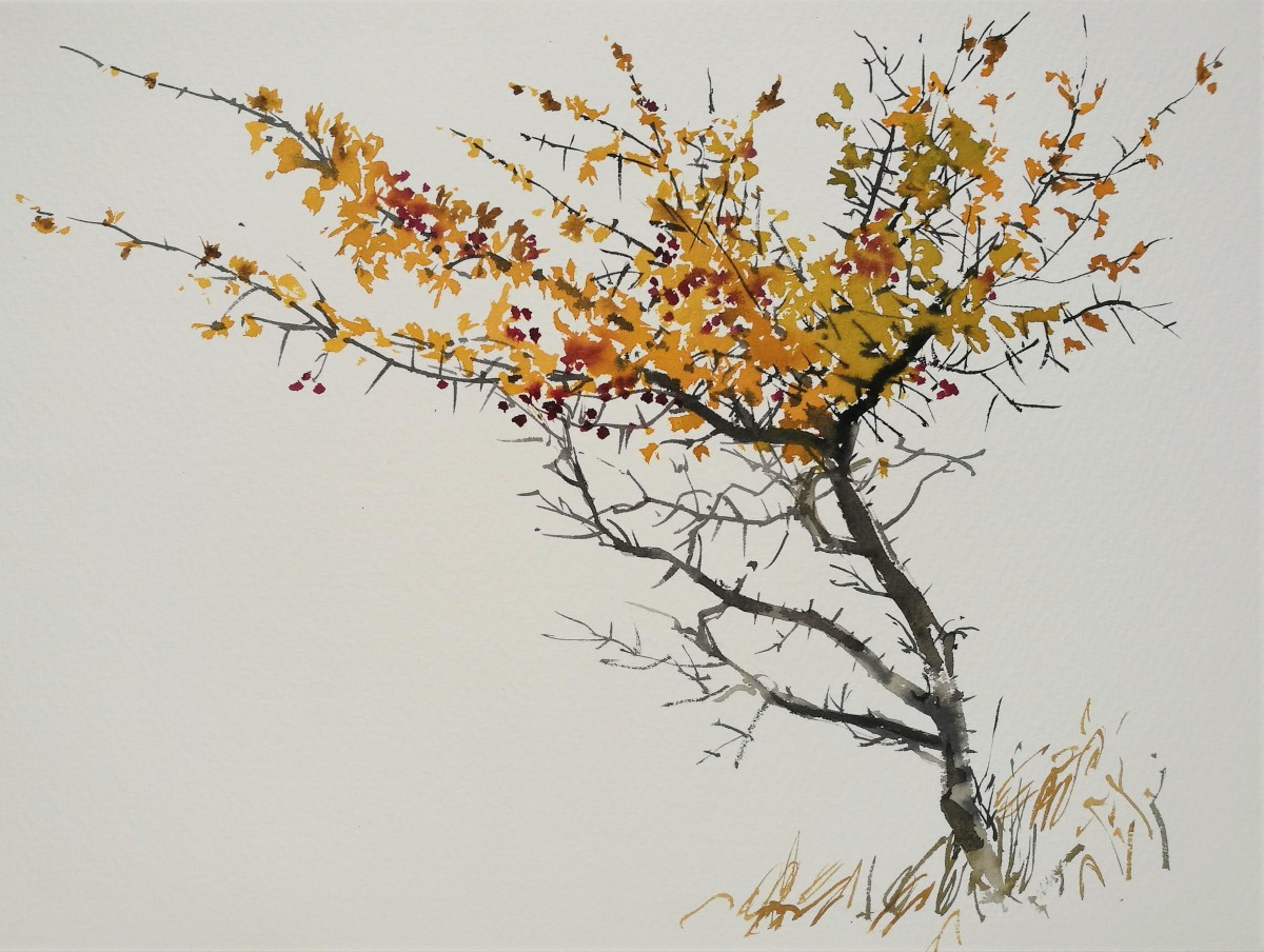 A fine dusty rain coupled with the generous washes of water and pigment meant that the paper took an eternity to dry. Before I could begin on the sea I needed to wait for the sky to dry somewhat, so I turned my attention to the rather stark and foreboding silhouette of the trees behind me. Most of the trees had dropped their leaves now, and it felt winter-like for the first time since much earlier in the year.