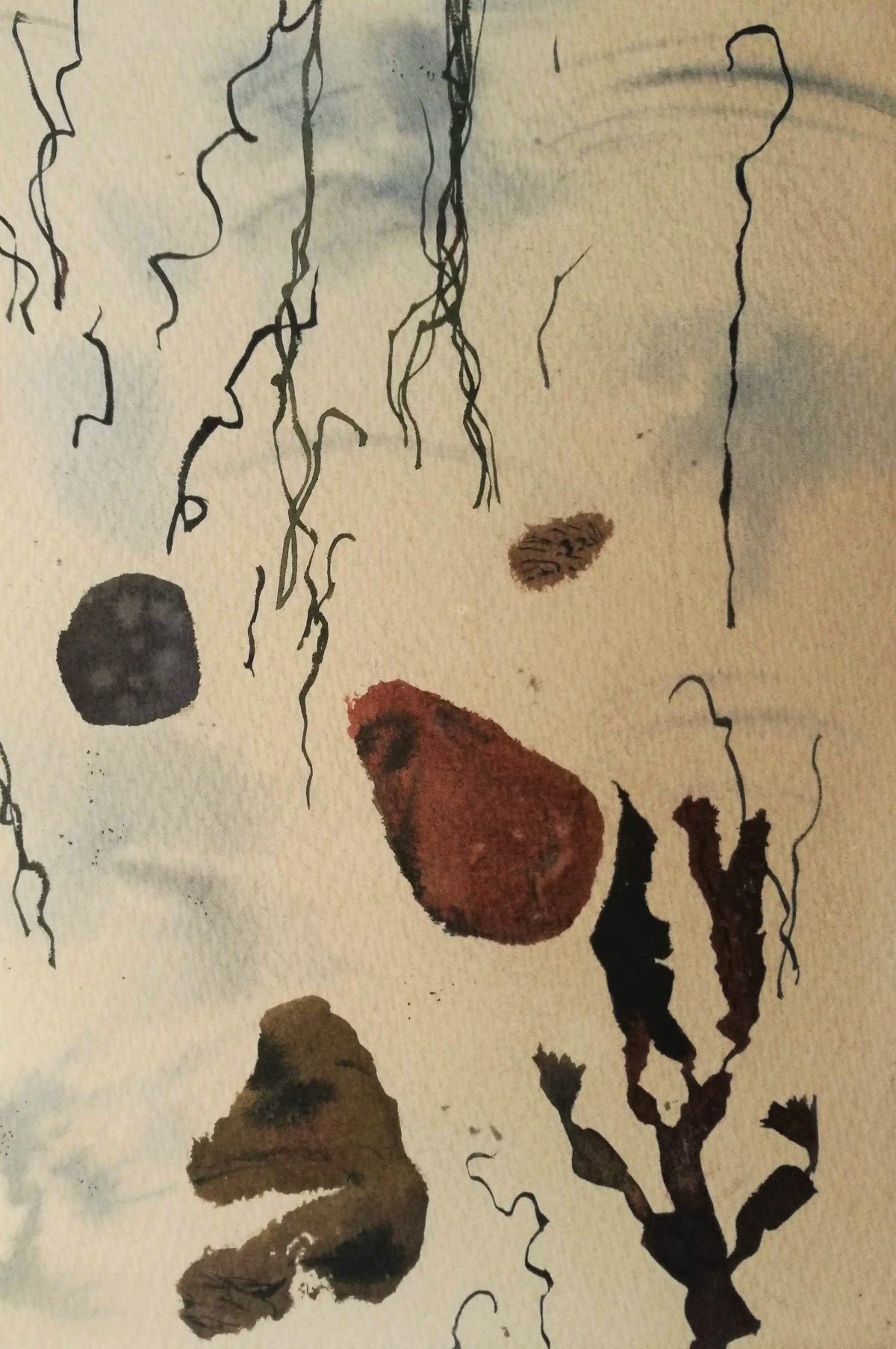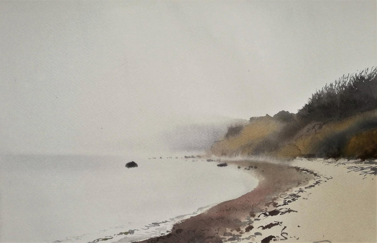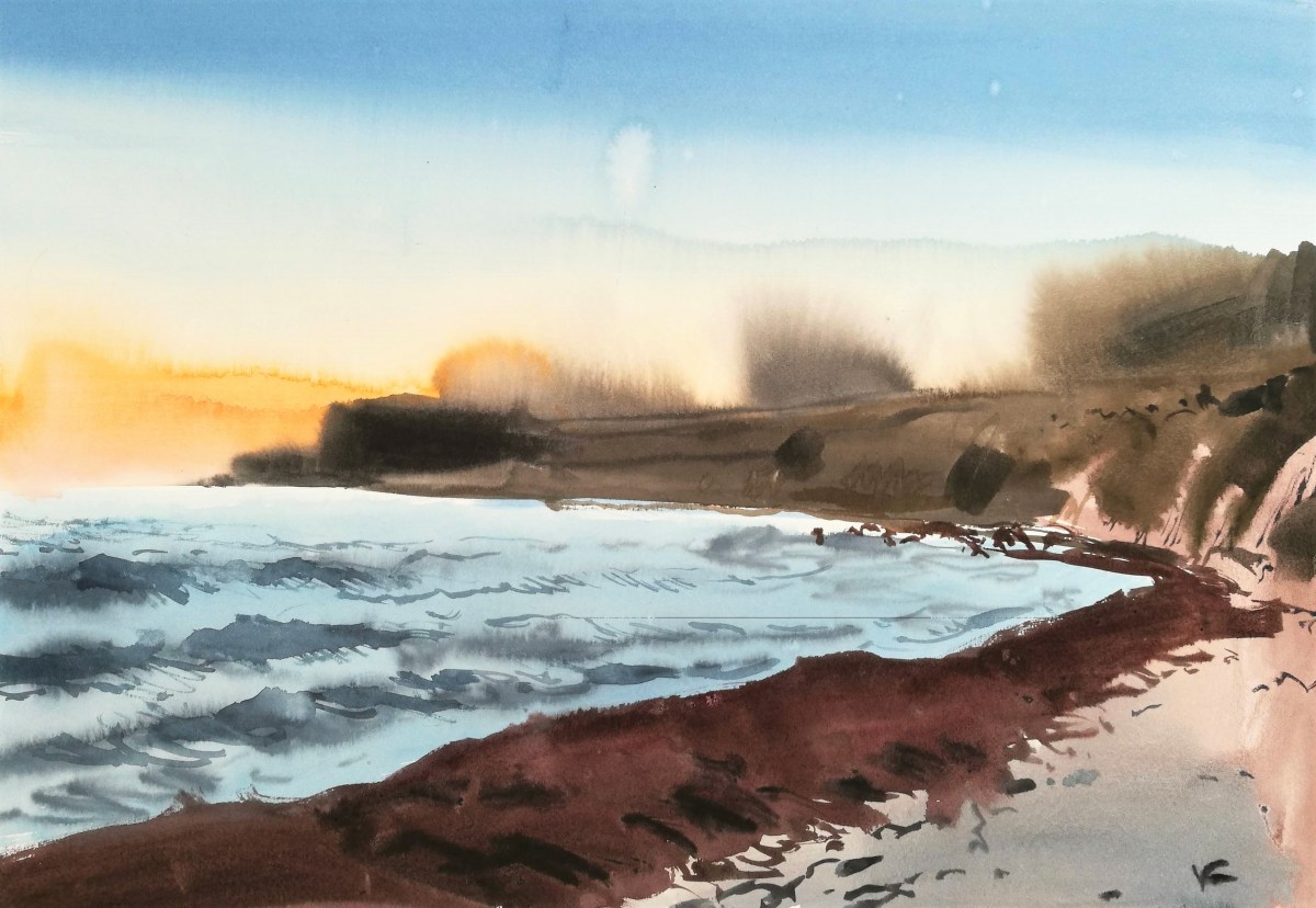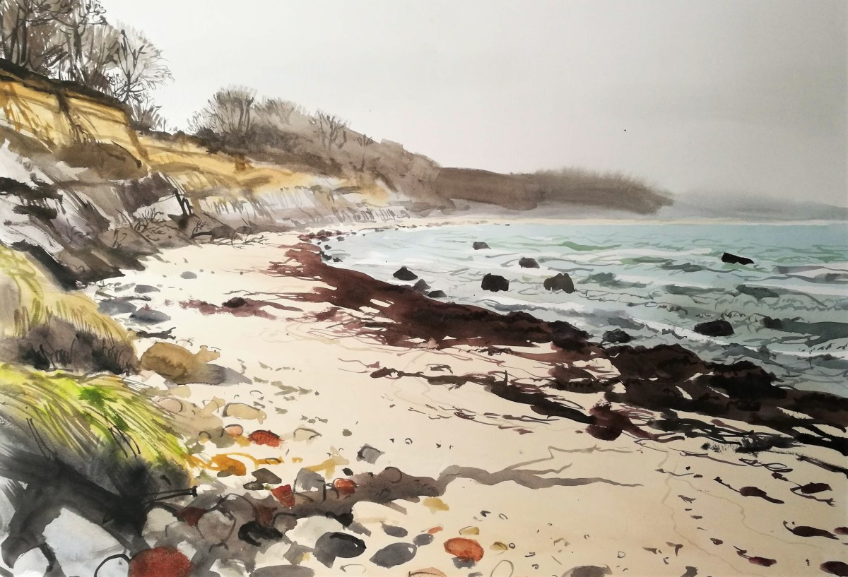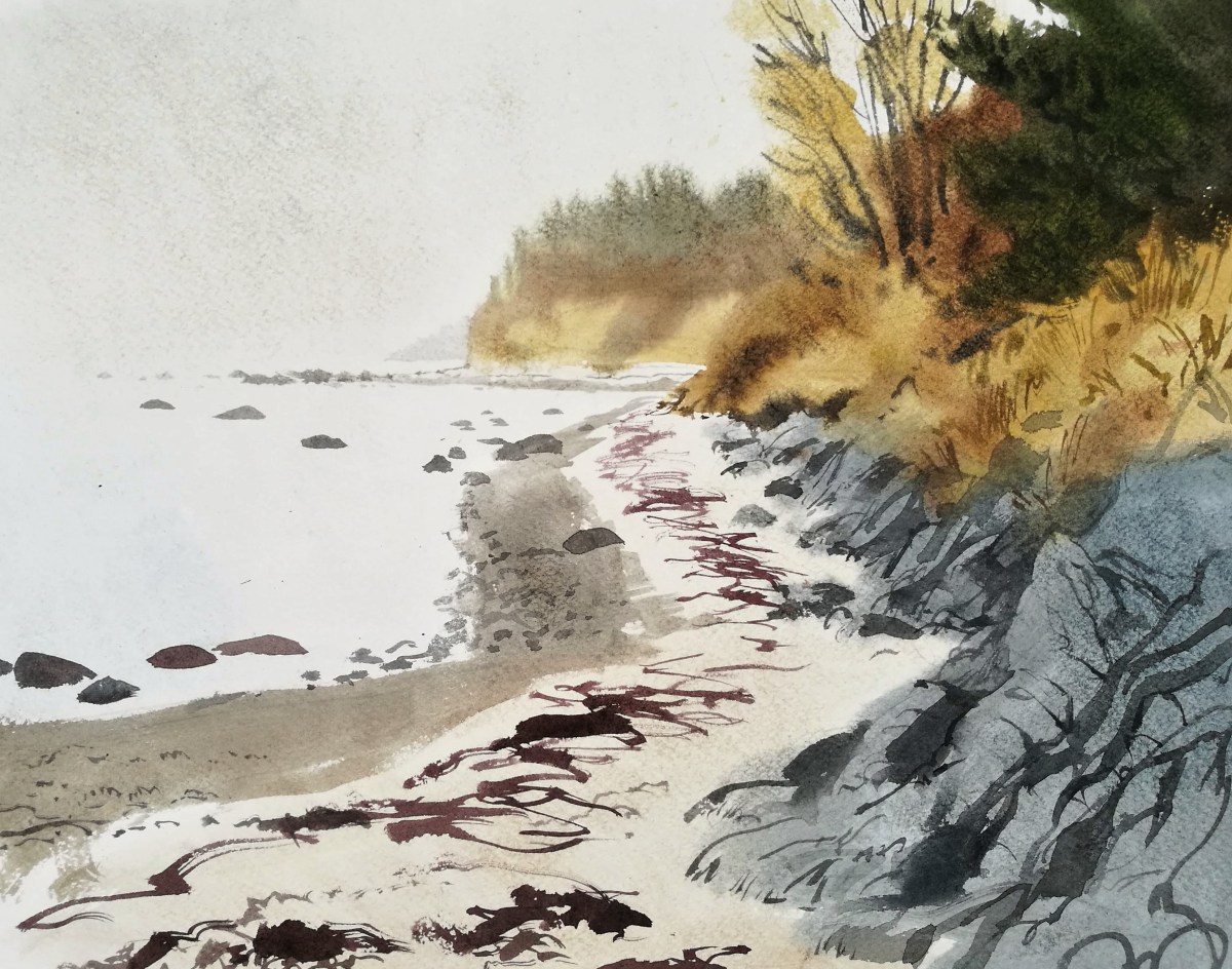 I packed up and walked on, arriving at the strange little quay or landing stage at Sose point, in front of which several fishermen were already waist deep in the water amongst the rocks. I walked on and found myself in a new bay with good views to the west – of next week’s destination, Arnager, and the faintest glimpse of Rønne and the journey’s end, beyond that. The geology was fascinating with a bewildering and I was split between wanting to paint the intricate patterns of the rust red ironstone and the layers of sediment exposed on the sloping sea cliffs. In the end I looked down and concentrated on the tiny strands of half-submerged seaweed leaving delicate patterns on the sand.