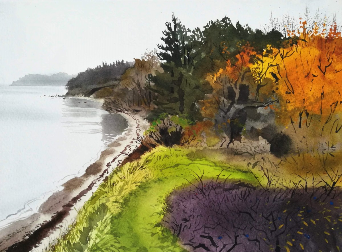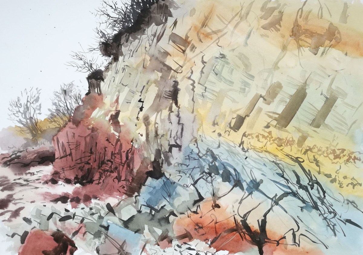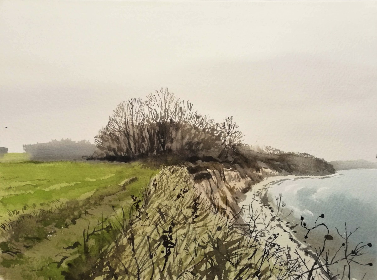 I soon arrived back at the beach and headed west again, now below the path upon which I had just walked. The water was low, thankfully as a high water sometimes makes it difficult to walk below the cliffs. Great landslides of mud and clay collapsed onto the beach taking trees and grass and depositing them on the pebbly shore. The coastline was being eaten by the waves, and the clifftop path I had just walked on would soon end up on the beach below. I looked back towards the east and painted the rich and dynamic colours and patterns, with rivulets of water seeping through the clay and running out on to the sand.